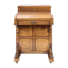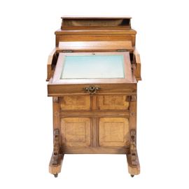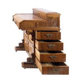 89x56x56 cm.ripiano in tessuto apribile, sormontato da un vano porta carte, quattro cassetti su un lato, provvisto di rotelle