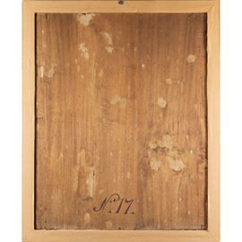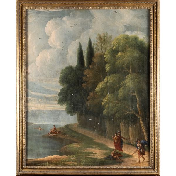 85x67 cm."Paesaggio con figure", olio su tavola, entro cornice