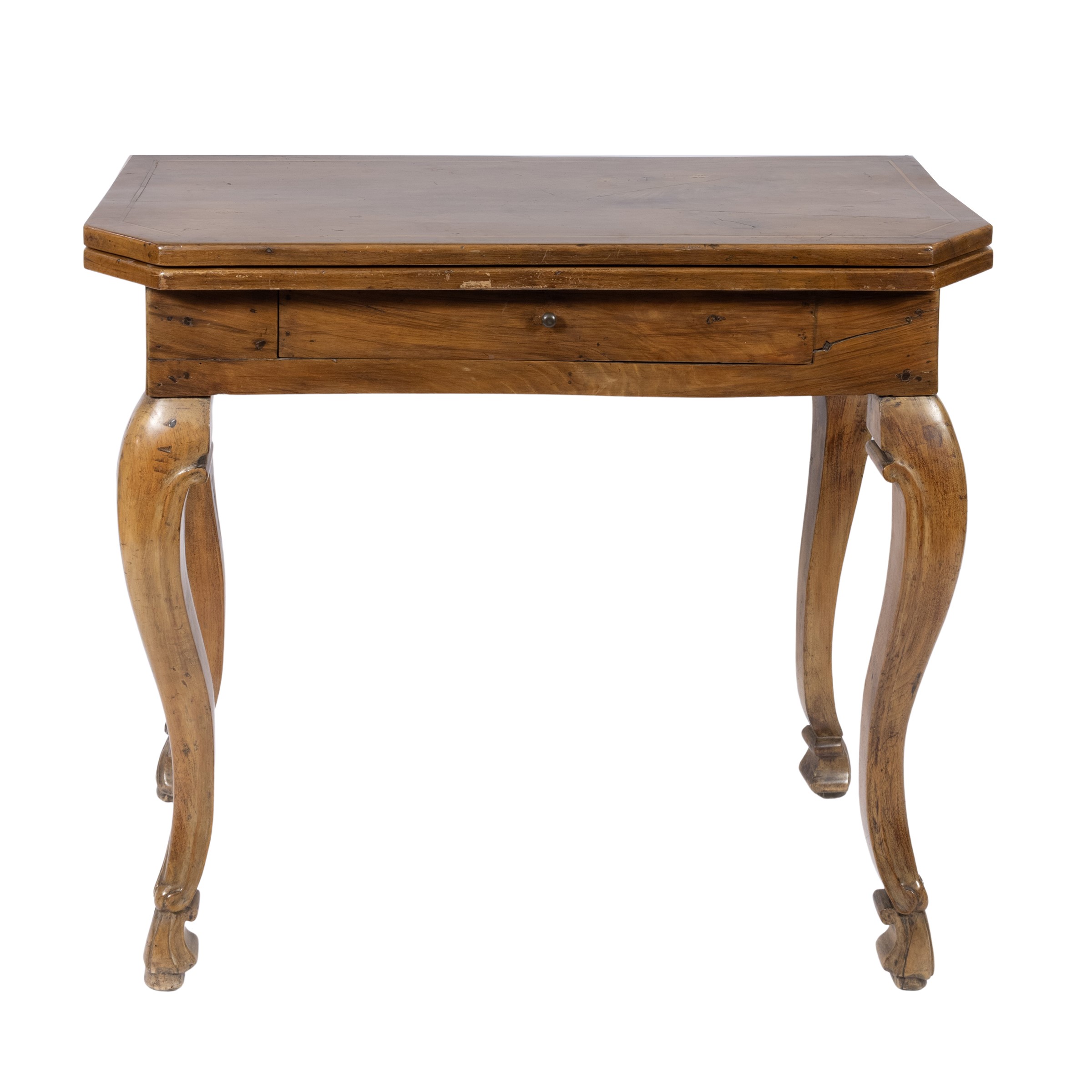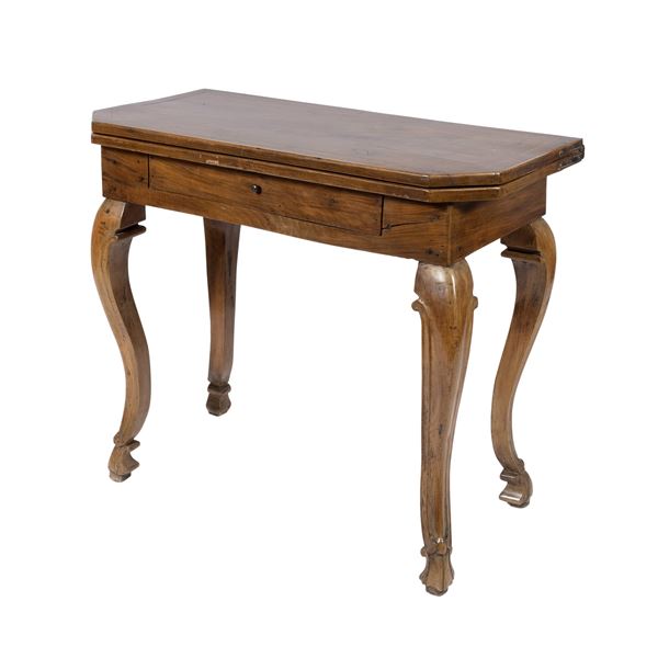 77x89x44 cm.piano sagomato apribile poggiante su quattro gambe di linea mossa, fascia centrata da un cassetto a scomparsa, usure