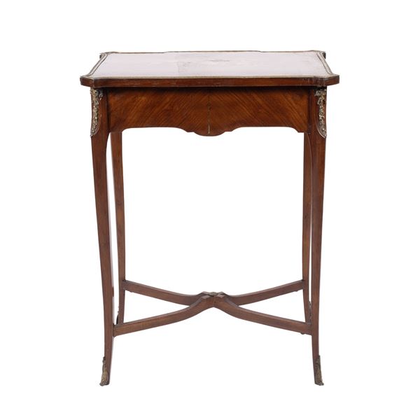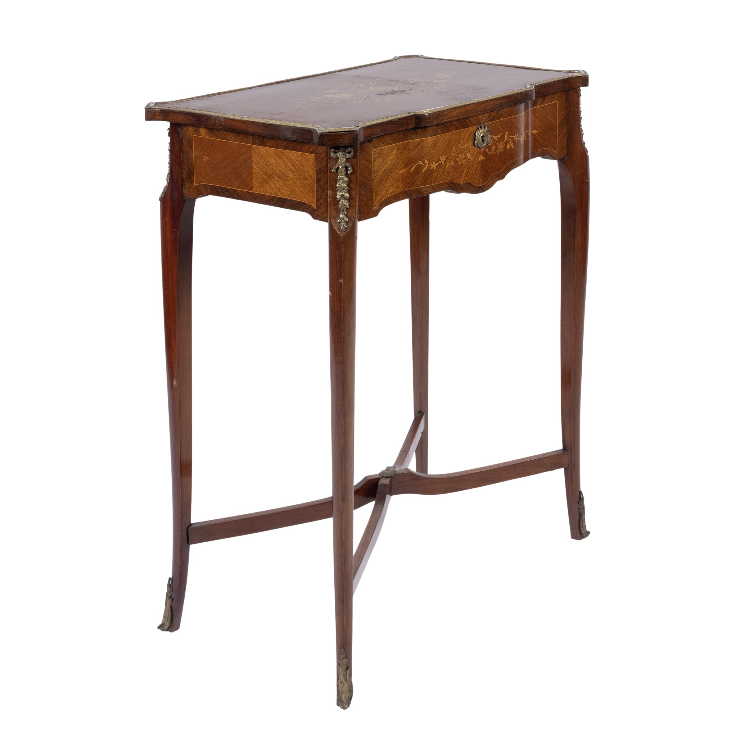 77,5x55xx36 cm.piano sagomato apribile con scomparti e specchio all'interno, un cassetto sottostante poggiante su gambe di linea mossa, montature in bronzo dorato, usure e difetti