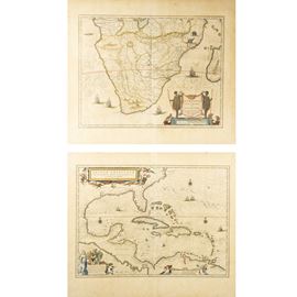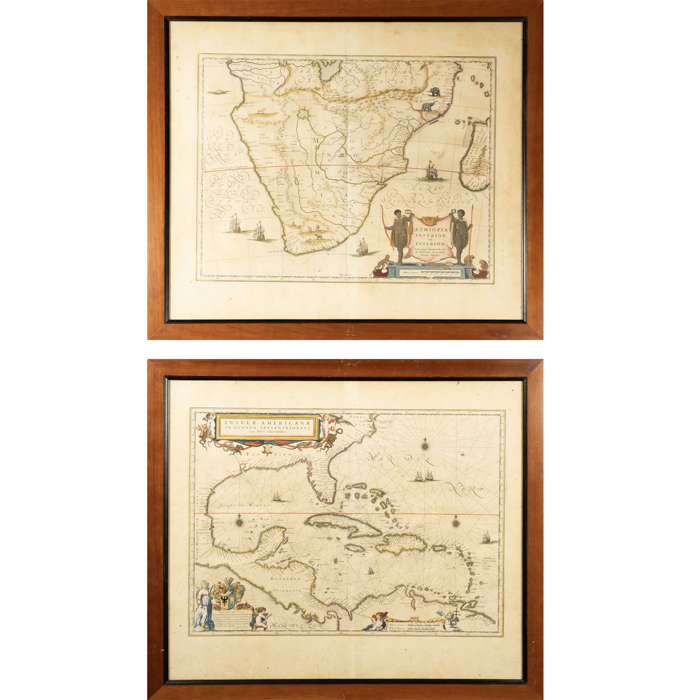 50x60 cm."Aethiopia inferior vel exterior - Insulae Americanae in Oceano Septentrionali, cum Terris adiacentibus", coppia di incisioni colorate all'acquerello, 1640 circa, entro cornici
