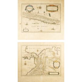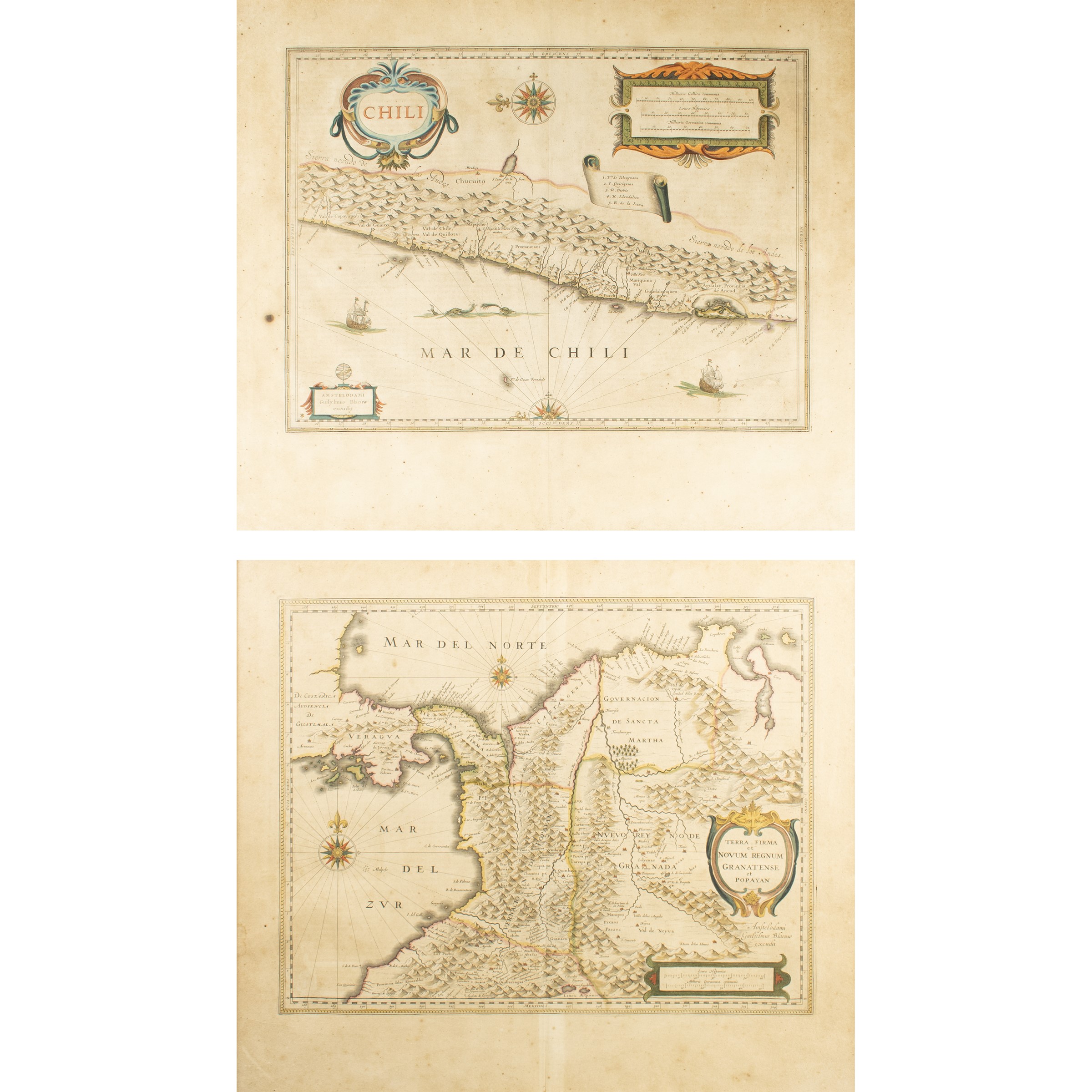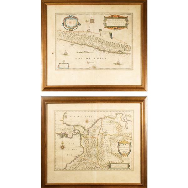 50x60 cm."Terra Firma et Novum Regnum Granatense et Popayan - Chili", coppia di incisioni colorate all'acquerello, 1640 circa, entro cornici