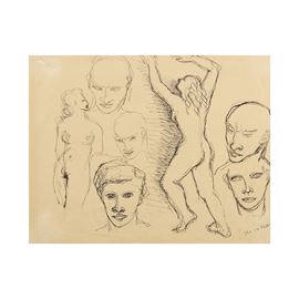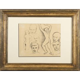 "Studi di volti e figure", inchiostro su carta, firmato "Marino" in basso a destra, entro cornice