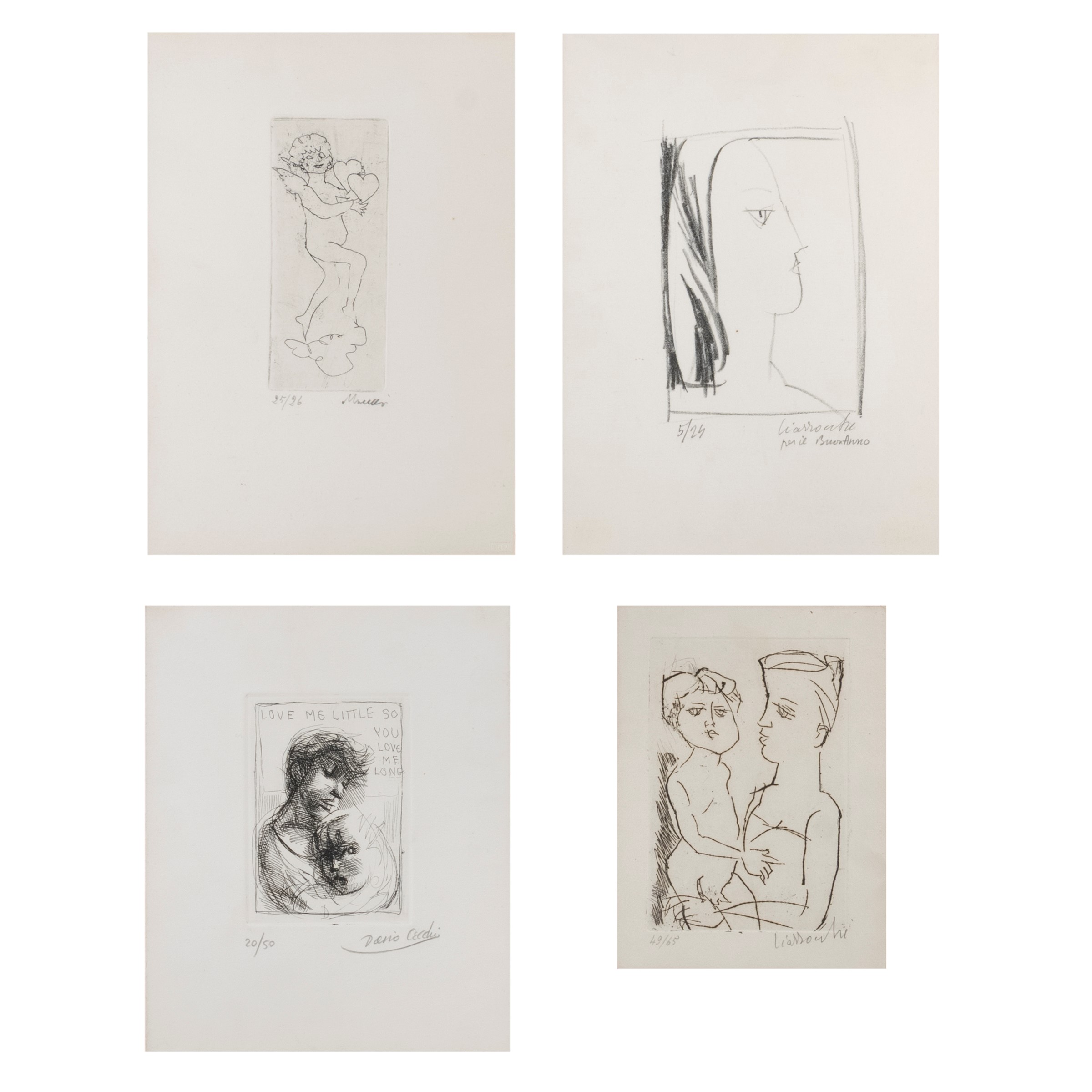 misura massima 26x17 cm.quattro incisioni di Mino Maccari, Dario Cecchi, Arnoldo Ciarrocchi (2), firmate e numerate, entro cornice