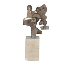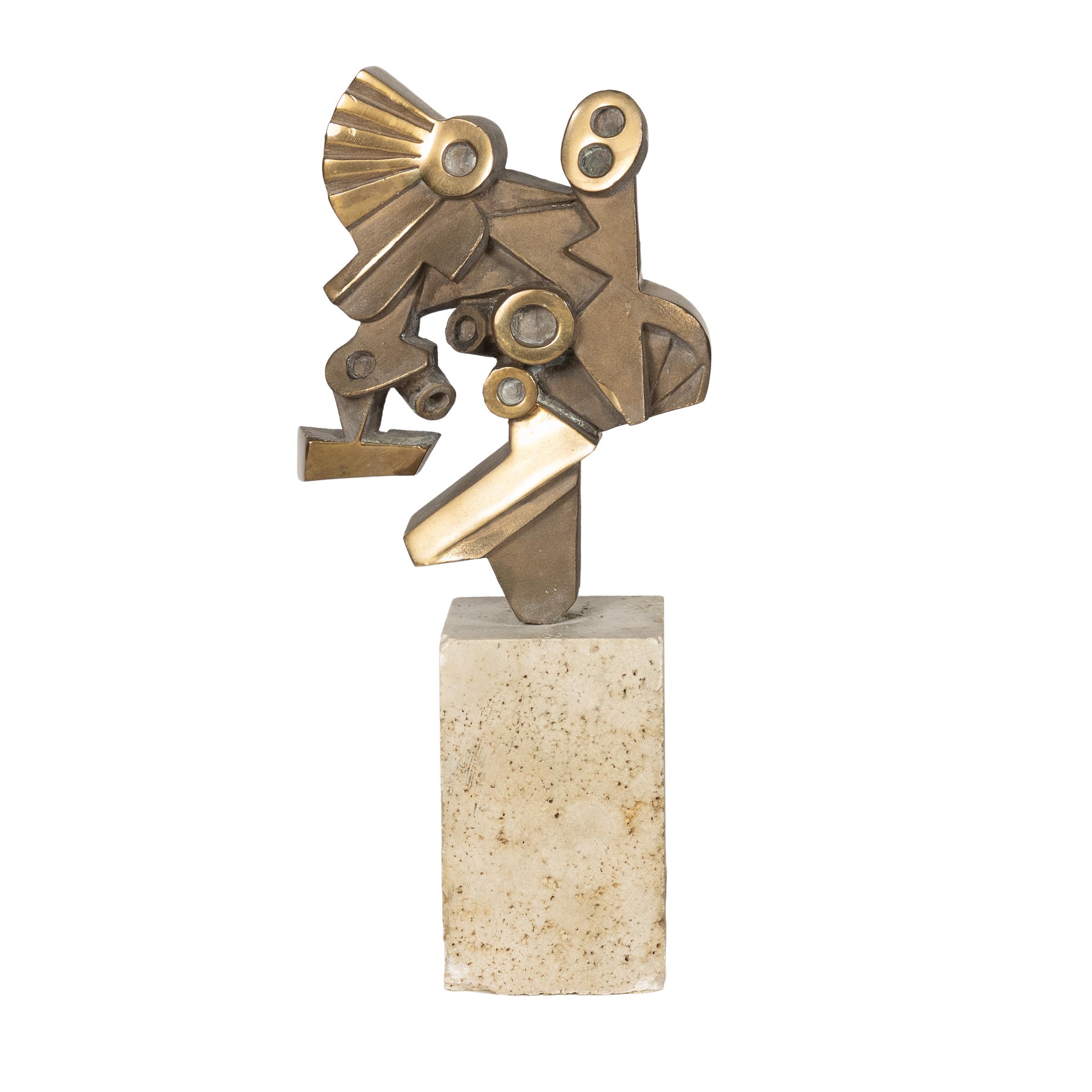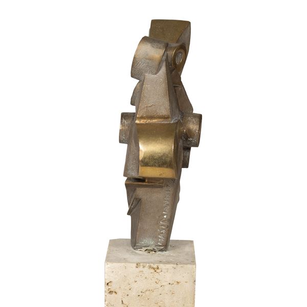 scultura in bronzo dorato, es. 78/100, firmato in basso, base di travertino