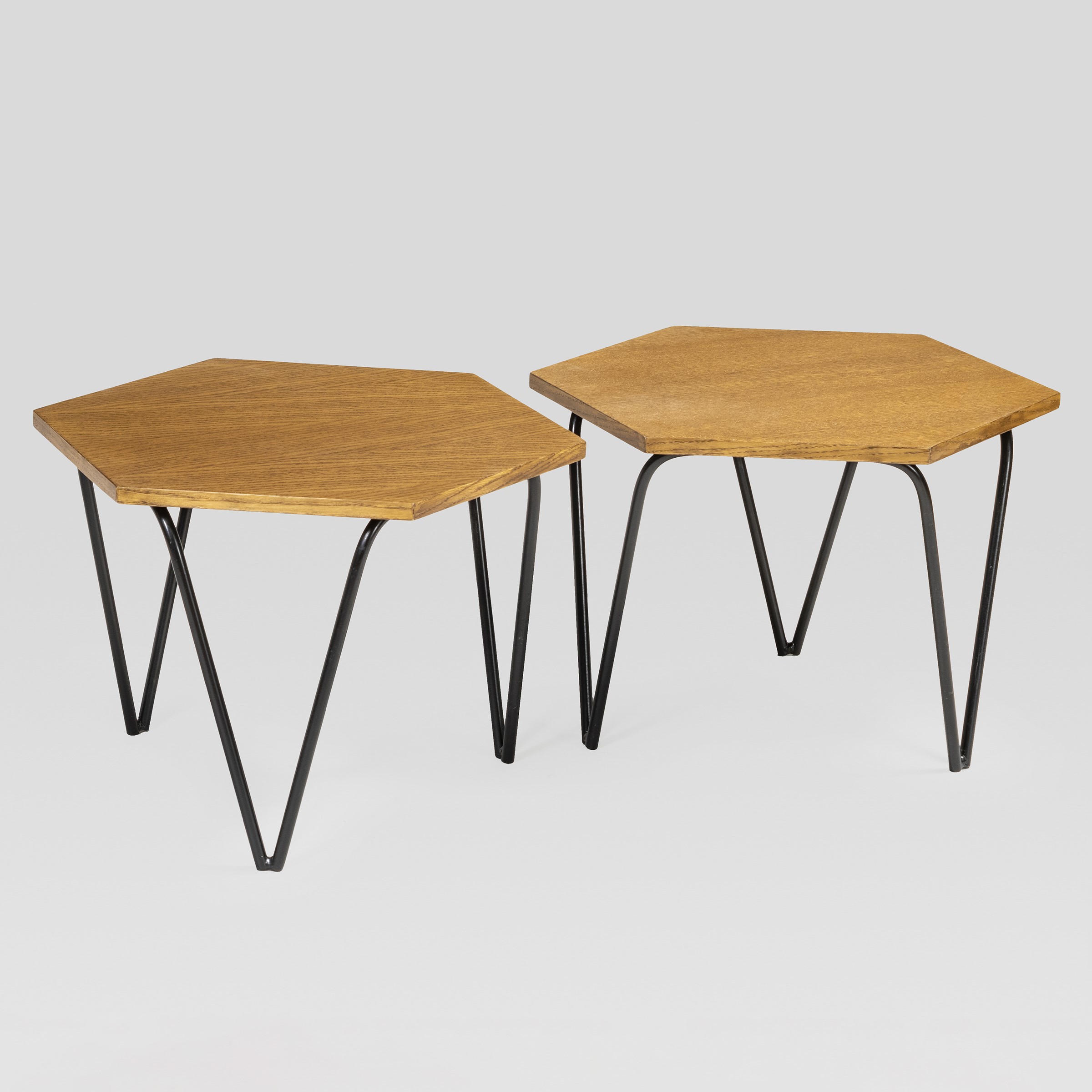 40x58x58 cm.coppia di tavolini in legno e metallo verniciato, etichetta della produzione, lievi usure.