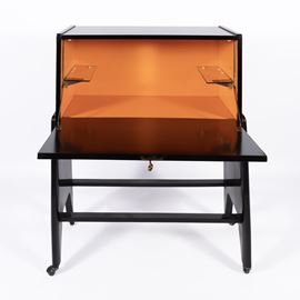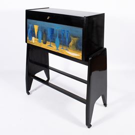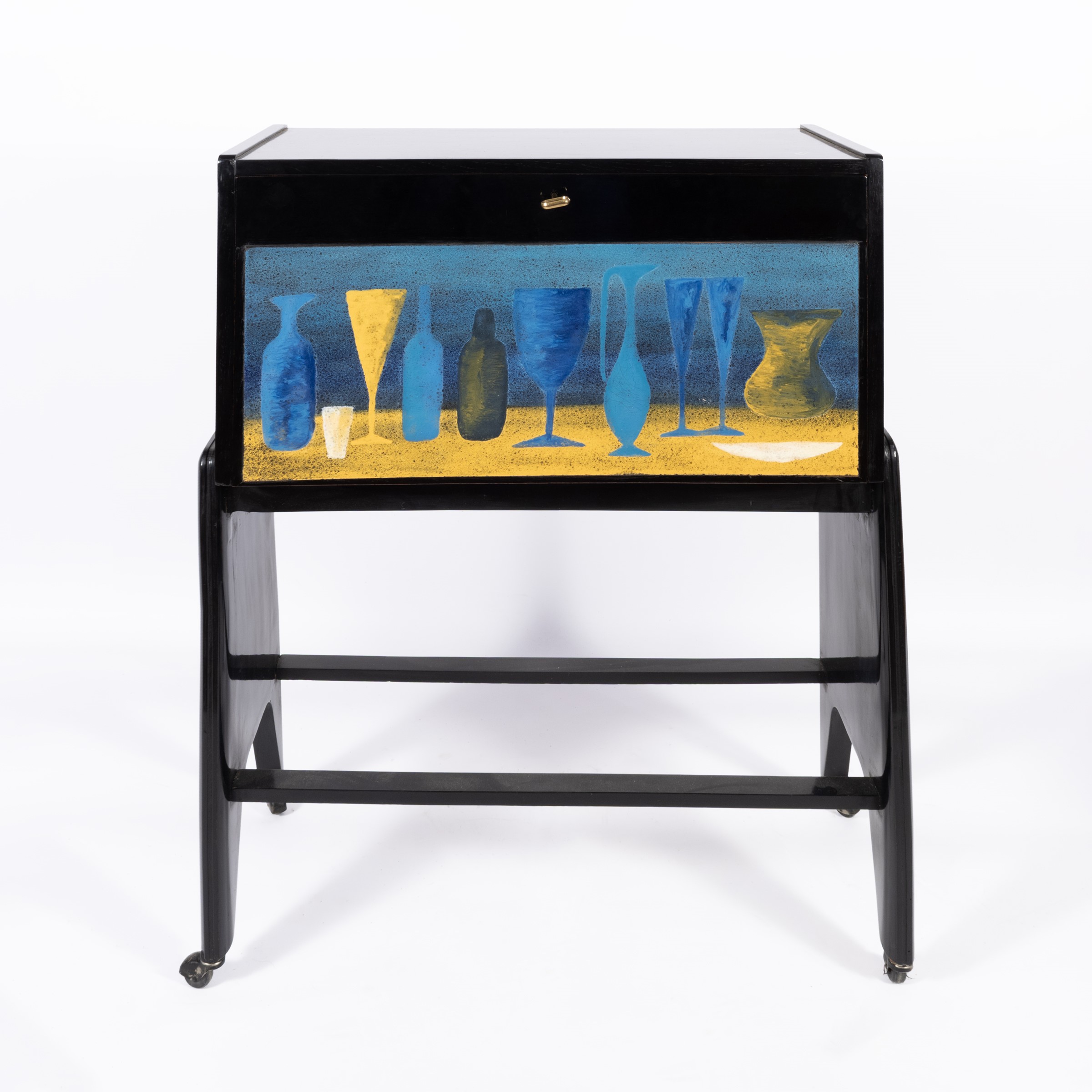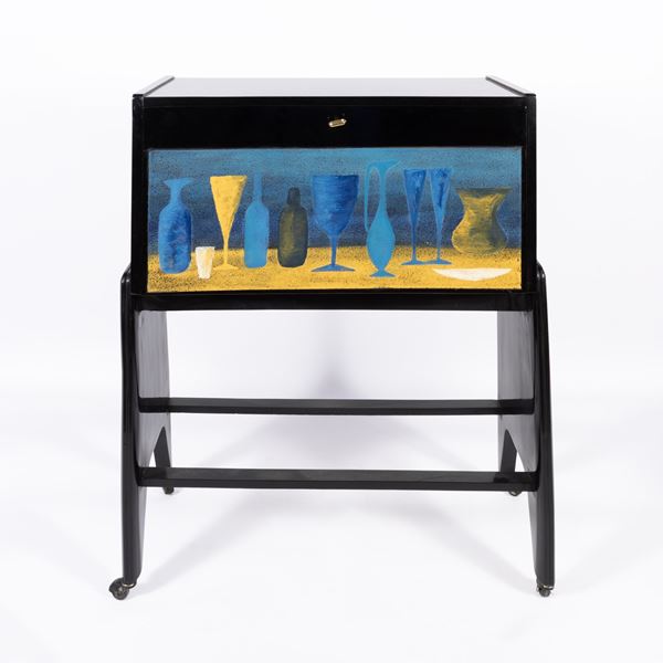 mobile bar in legno dipinto, ottone, ceramica smaltata e vetro trasparente, lievi usure