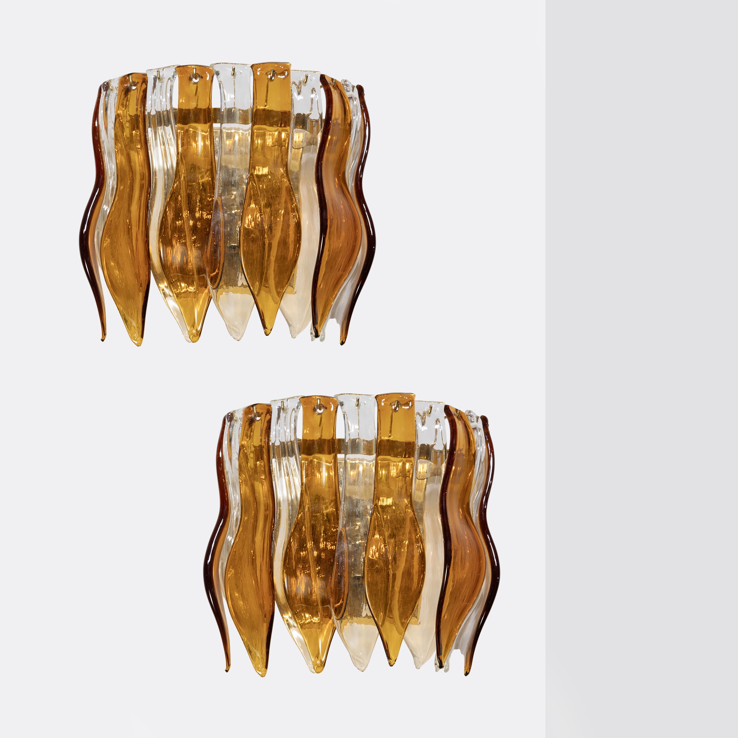 32x30x19 cm.coppia di lampade da parete in metallo dorato, vetro trasparente e vetro colorato, lievi usure