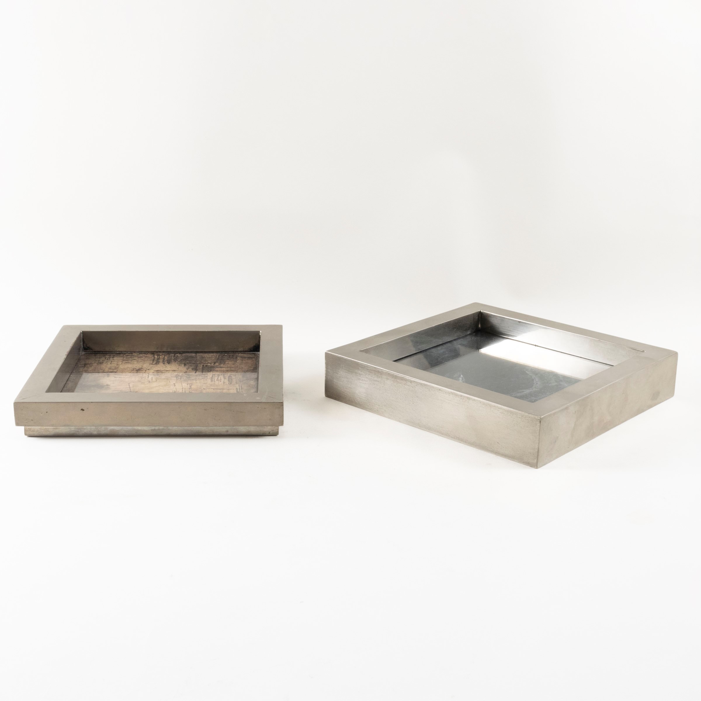 coppia di svuotatasche in metallo argentato, vetro e sughero, lievi usure