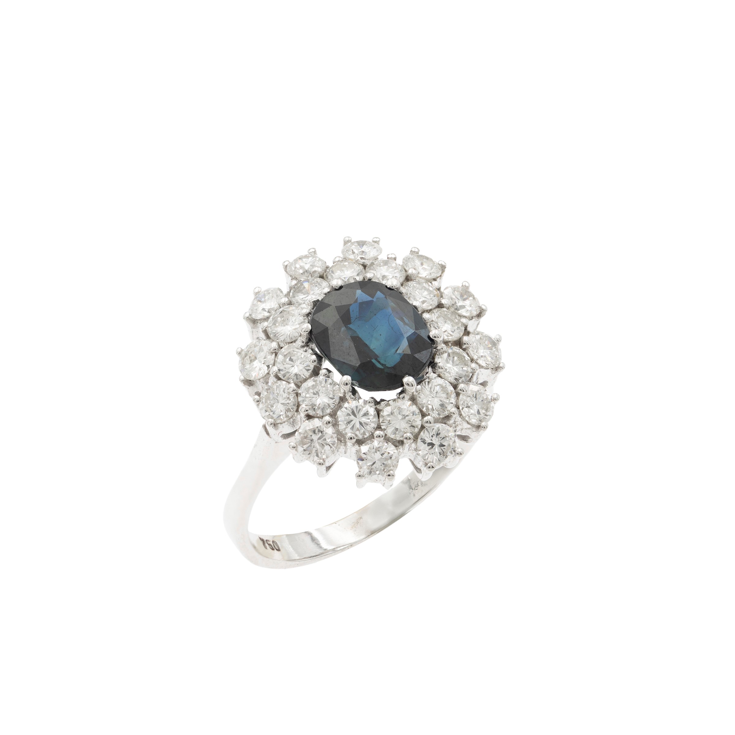 peso 6 gr.zaffiro taglio ovale ct 1,10 circa, diamanti taglio brillante ct 1,70 circa, misura 15