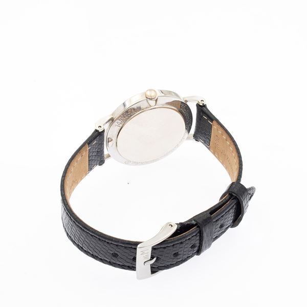 lunghezza 20 cm.in oro bianco 14kt, ref. 727-722-103D 3403, cassa tonda 33 mm. quadrante argentato indici con diamanti taglio brillante, movimento meccanico a carica manuale, calibro J. Le Coultre 480/cw, cinturino con fibbia in metallo