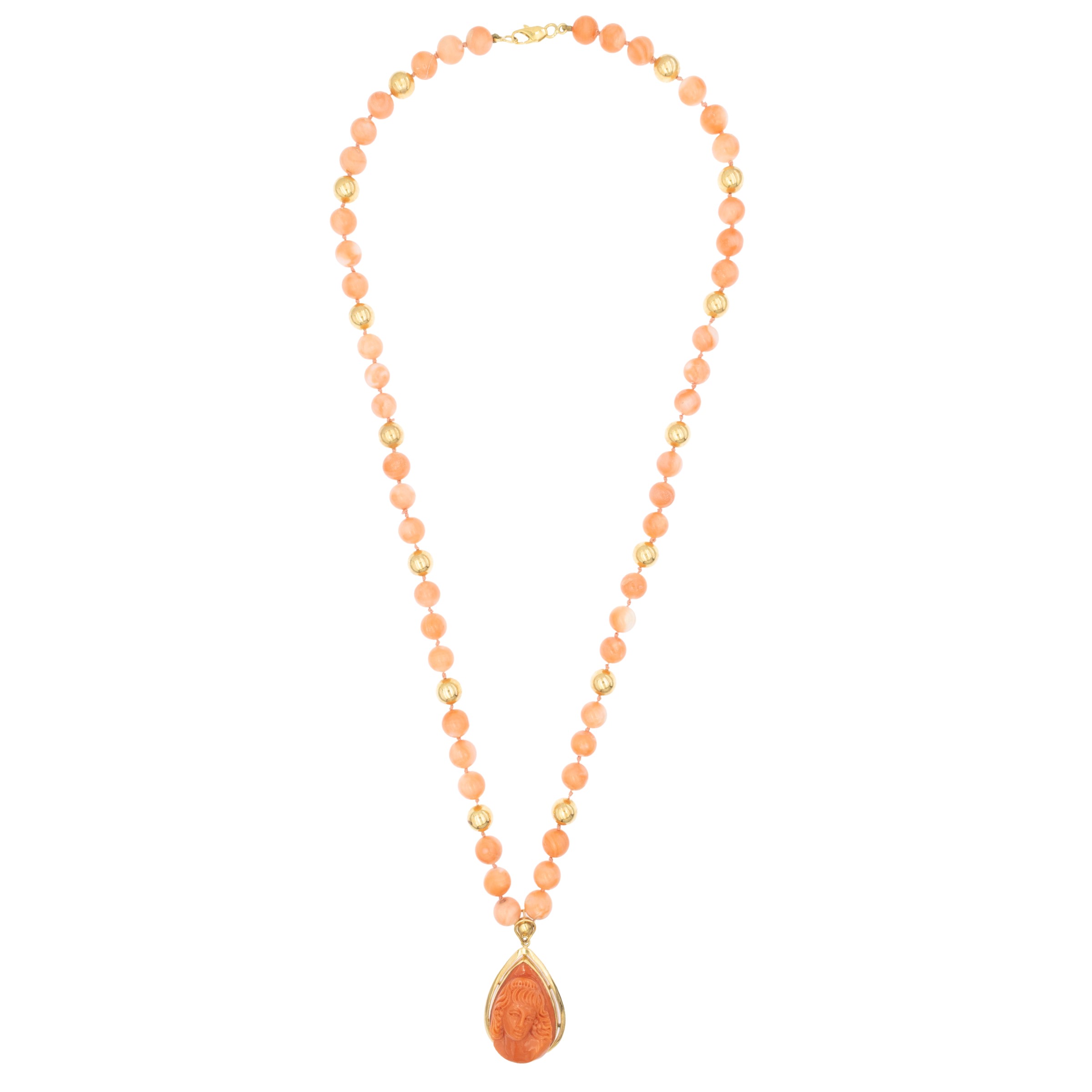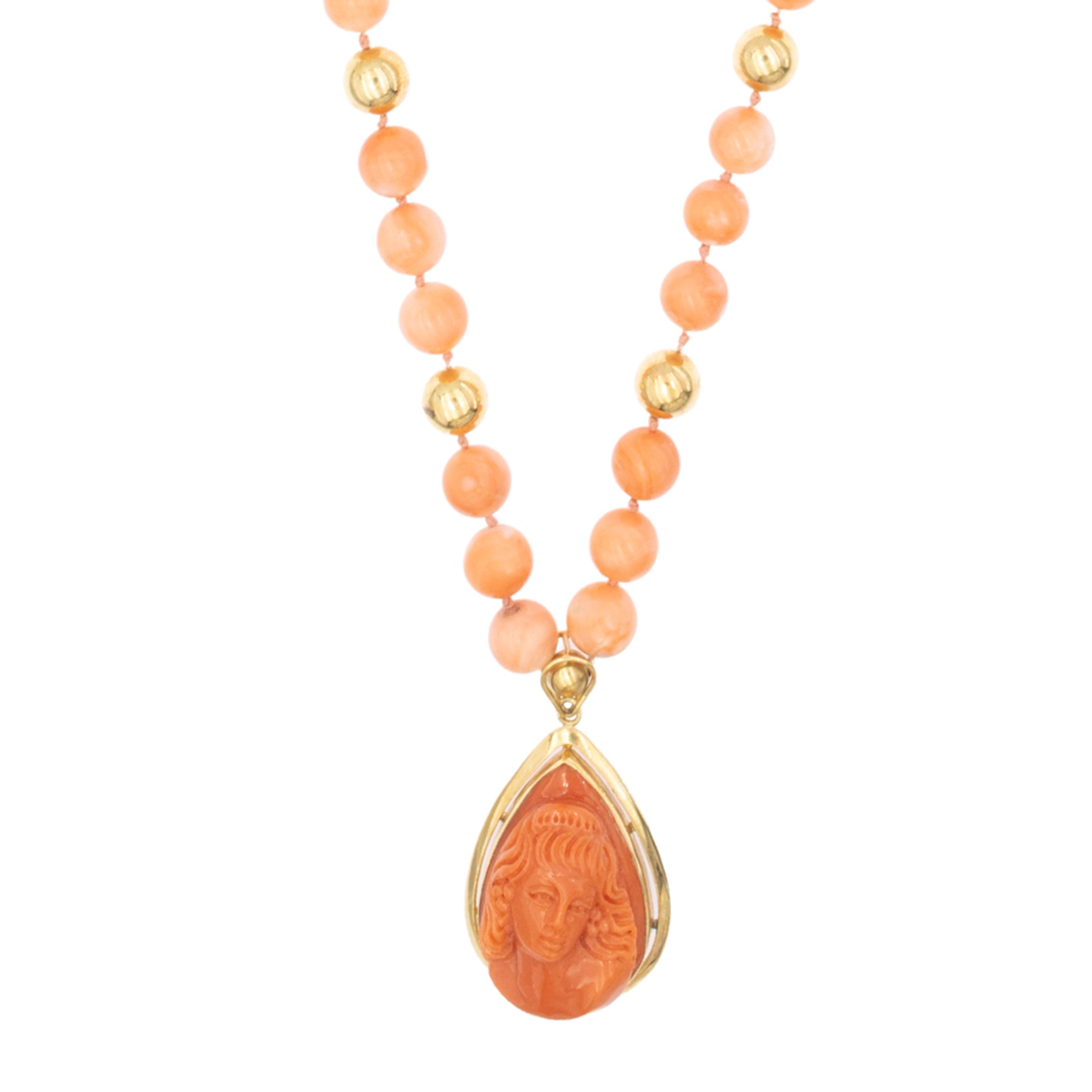 alternato da sfere in oro giallo 18kt, pendente in oro giallo con cammeo in corallo scolpito a raffigurare volto femminile, lunghezza pendente 3,5 cm. - collana 61 cm.