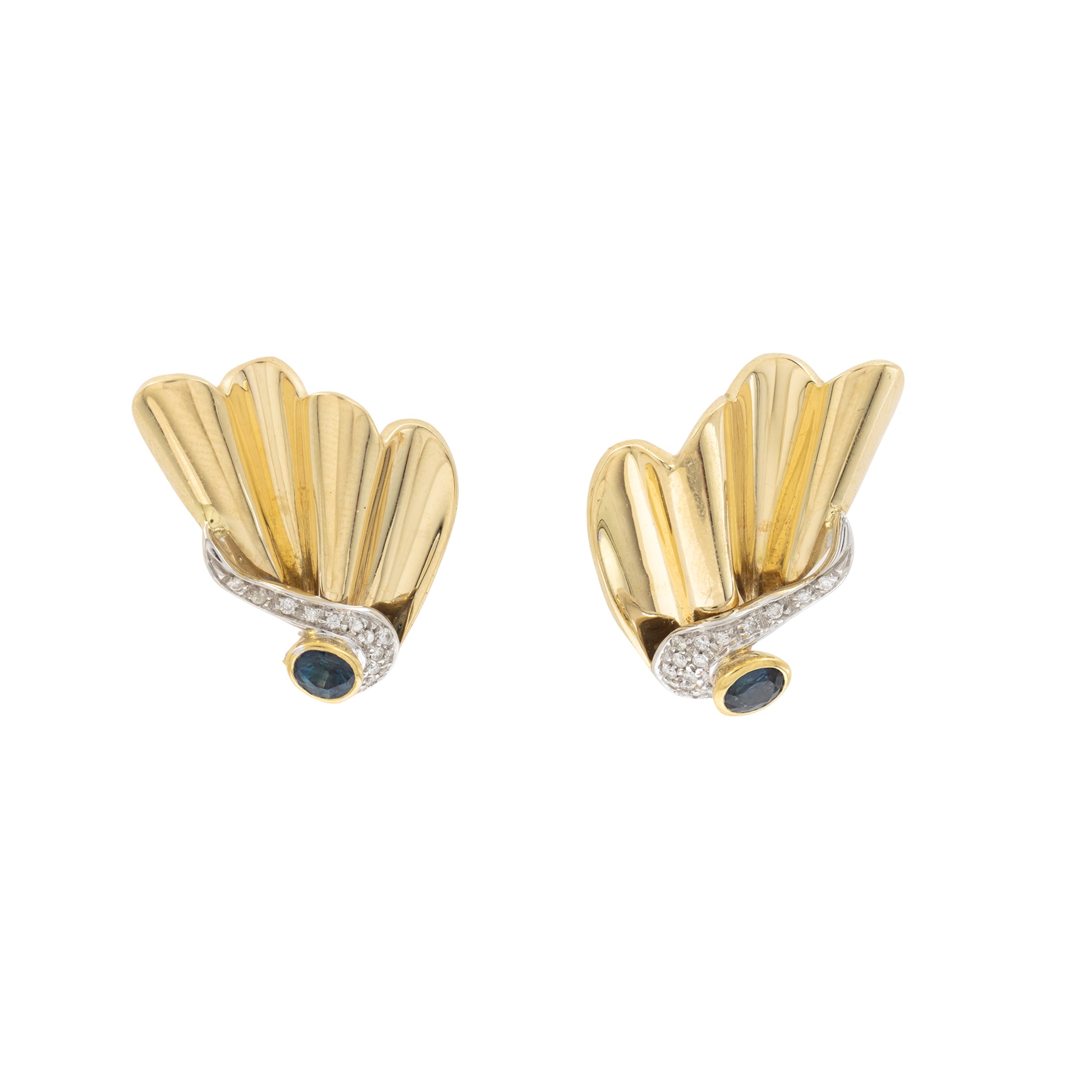 due zaffiri ovali ct 0,50 circa e diamanti taglio huit-huit ct 0,30 circa montati su oro bianco 18kt, dimensioni 2,1x2,5 cm.