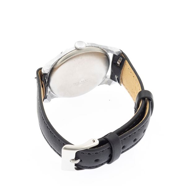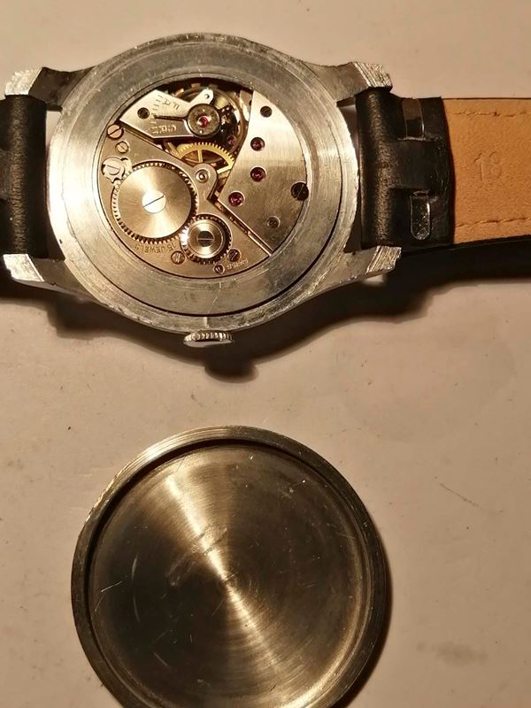 lunghezza 20 cm.in acciaio, cassa tonda 35 mm., quadrante argentato con indici e numeri arabi, contasecondi ore 6, movimento 17 rubini scappamento ad ancora, carica manuale, cinturino con fibbia in metallo