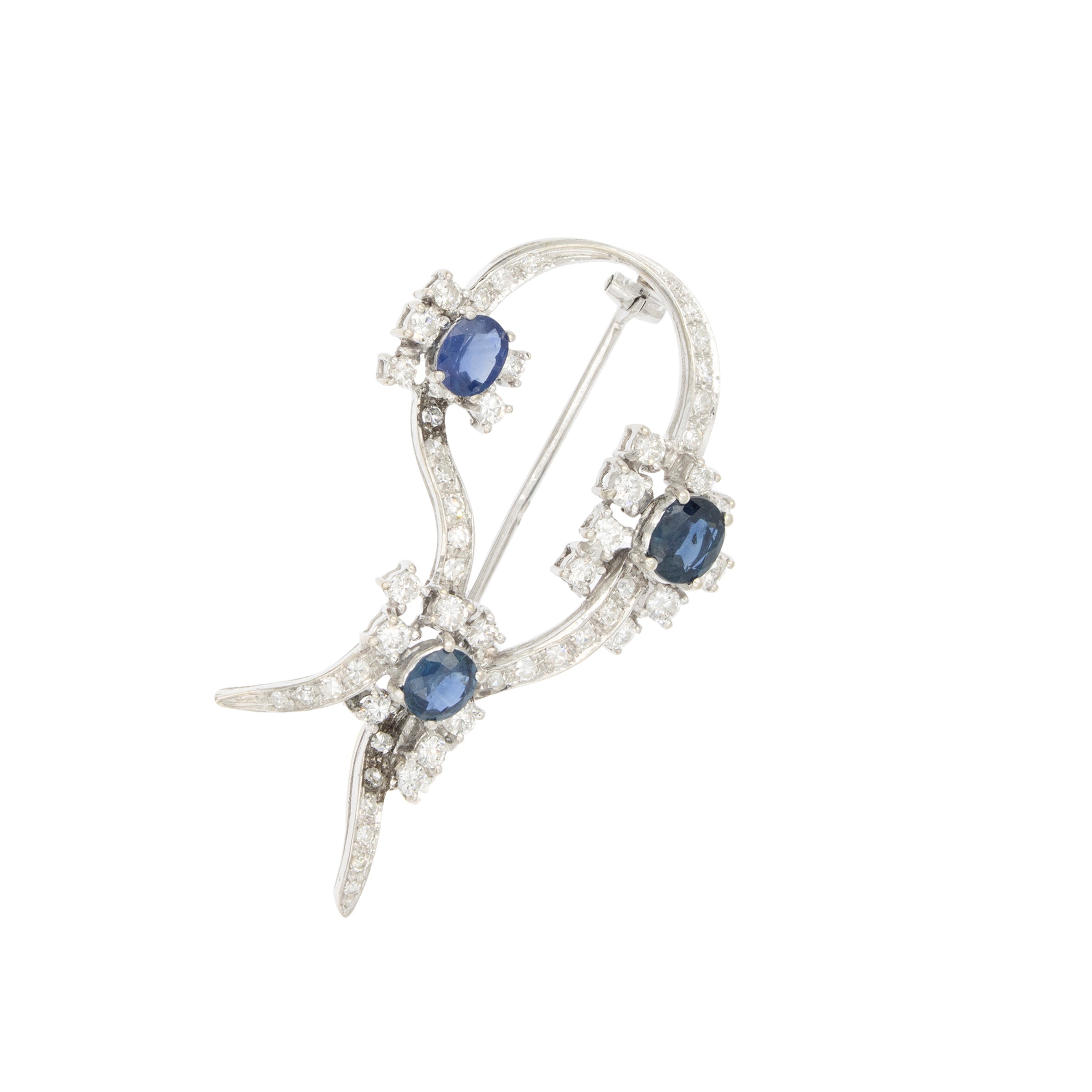 Spilla a motivo floreale in oro bianco 18kt zaffiri e diamanti