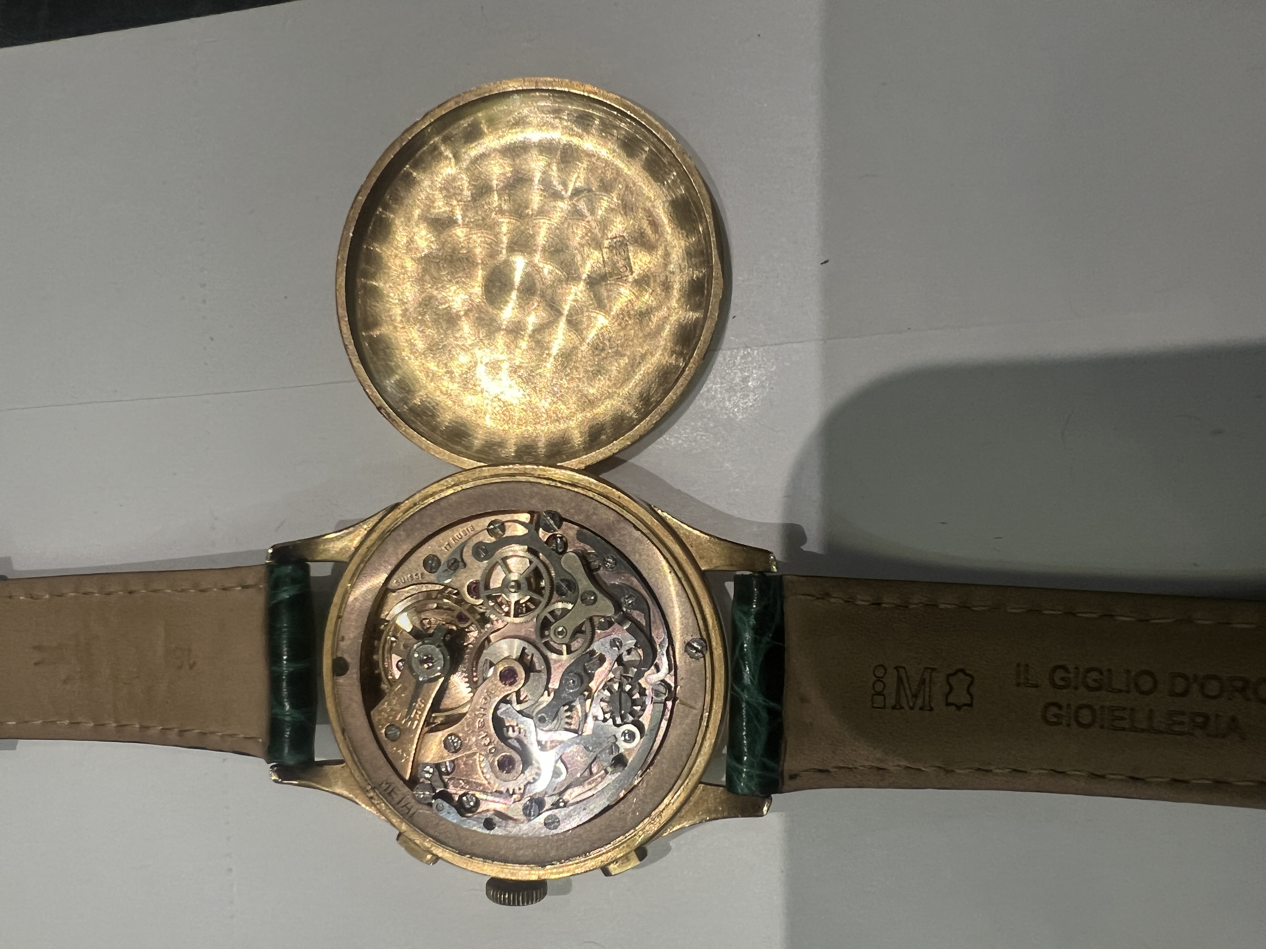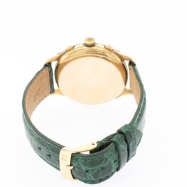 peso 48 gr.in oro giallo 18kt, cassa tonda 38 mm. quadrante argentato con indici e numeri arabi , due quadranti ausiliari per il cronografo, scala tachimetrica, scala dei minuti primi, movimento meccanico a carica manuale, calibro Valjoux 23, cinturino con fibbia in metallo dorato