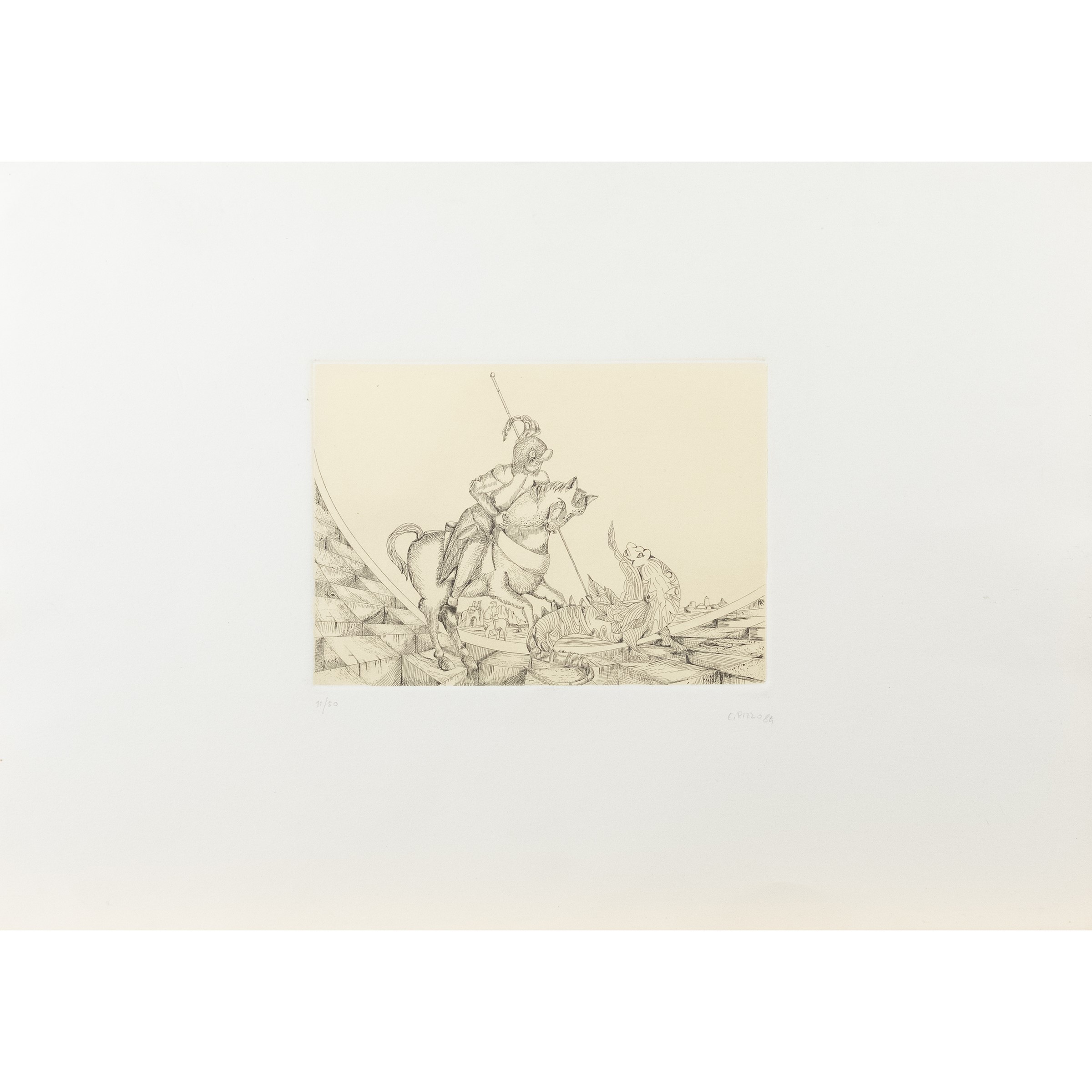 35x49,5 cm."Cavaliere e drago", 1984, acquaforte, es. 11/50, firmato "E. Rizzo" e datato in basso a destra, foglio libero