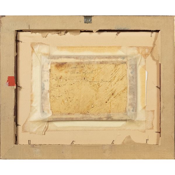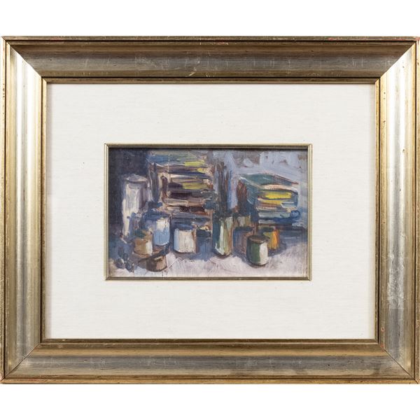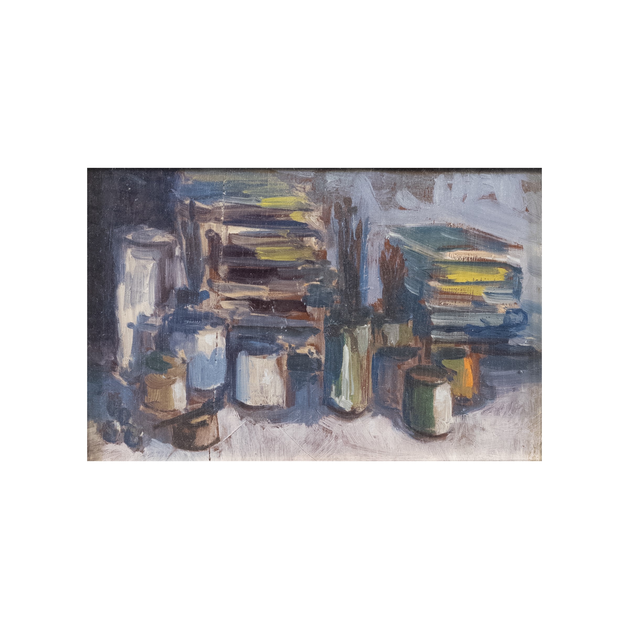 12x19 cm."Natura morta con pennelli e libri", 1990, olio su tavoletta, firmato sul retro, entro cornice