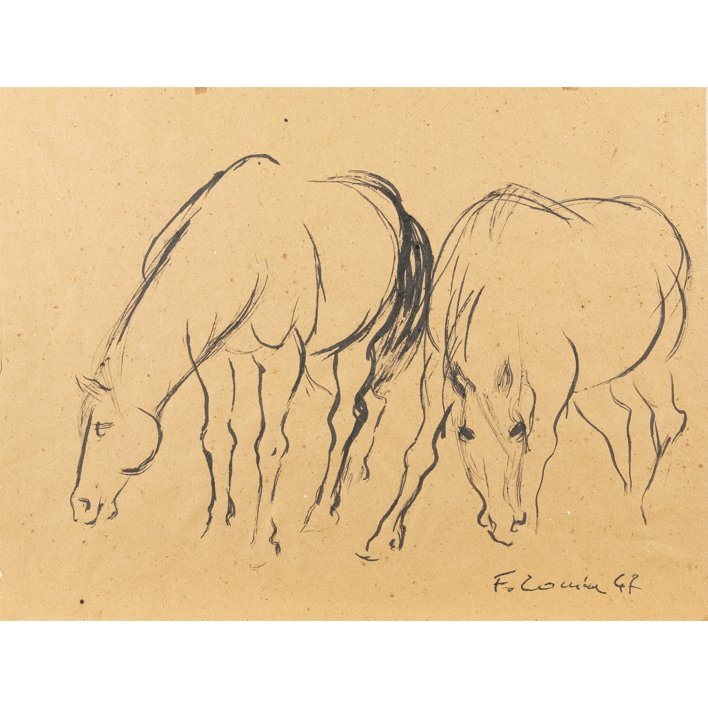 34,5x44,5 cm."Due cavalli", 1947, china su carta, firma di difficile lettura e data in basso a destra, foglio libero