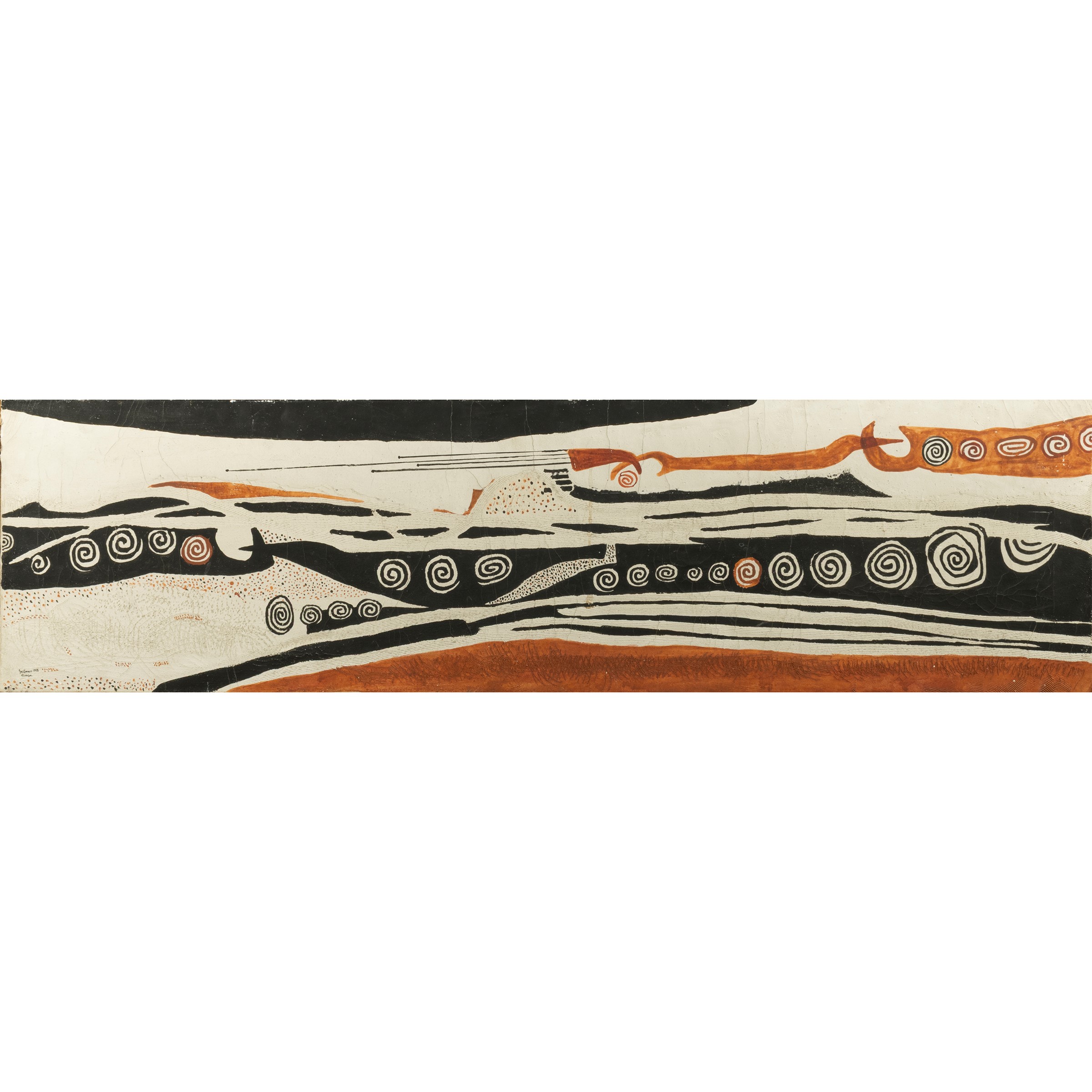 30x110 cm.tempera a rilievo e graffita su tela, firmata e datata in basso a sinistra