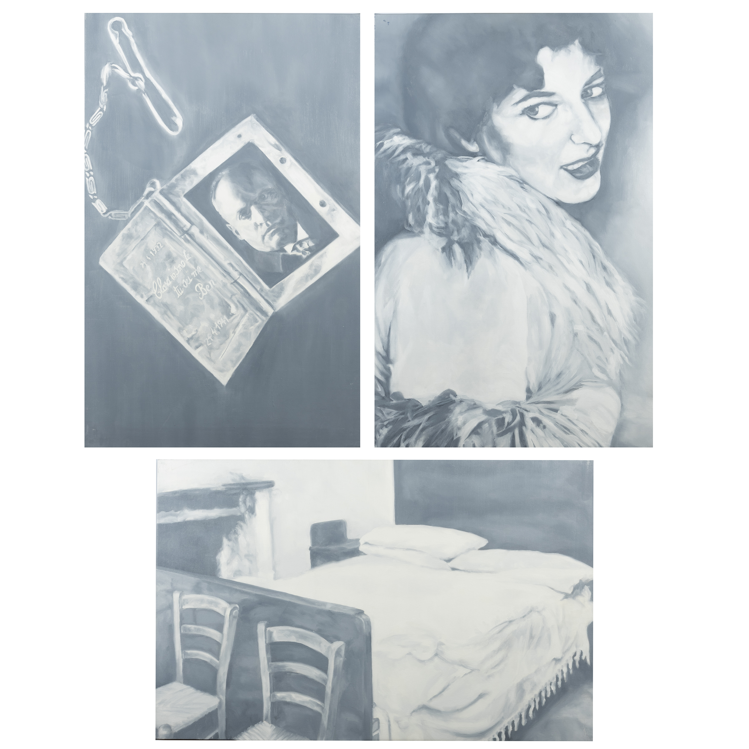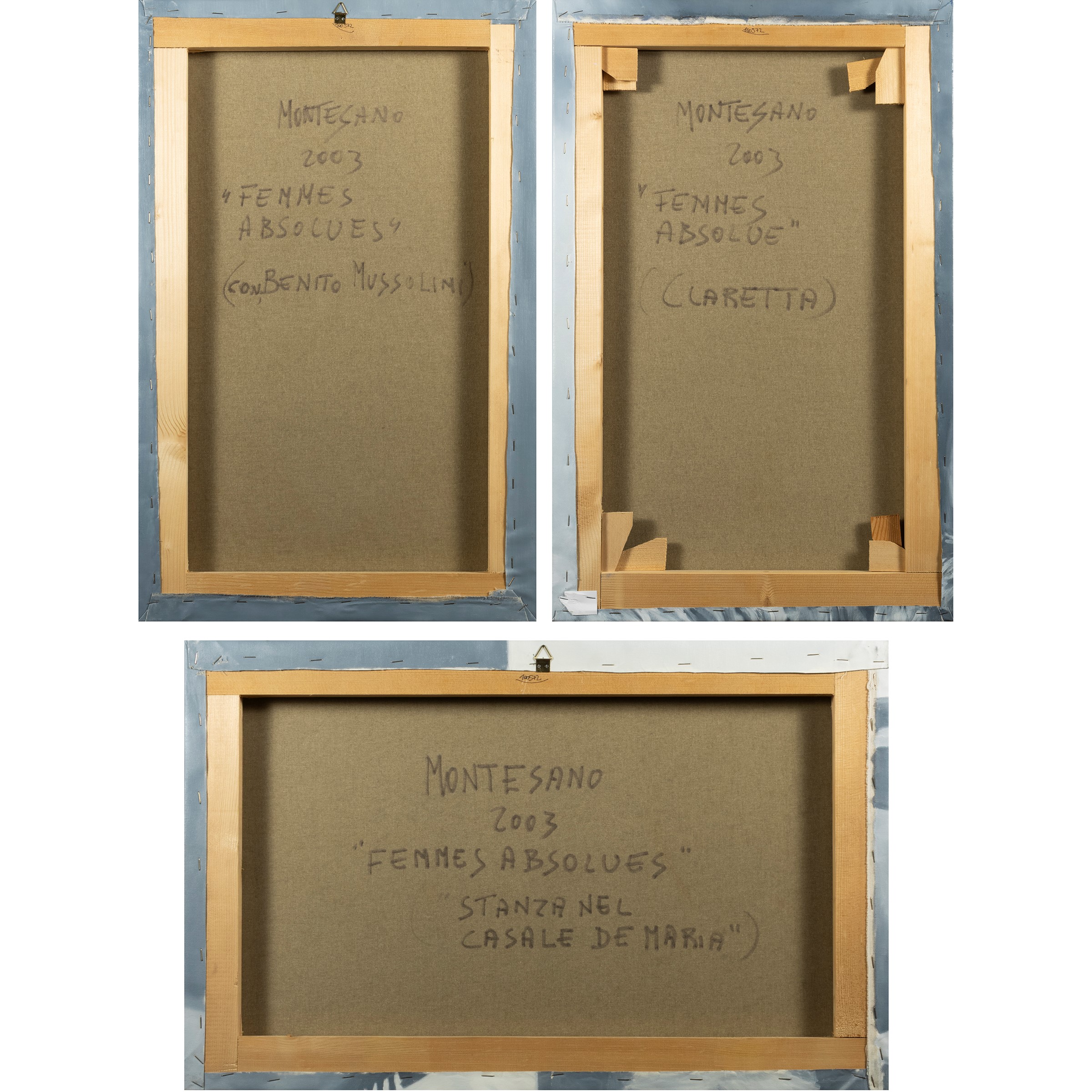 70x45 cm. e 45x70 cm."Claretta Petacci", "con Benito Mussolini" e "Casale De Maria", olio su tela, firmate, datate e titolate sul retro