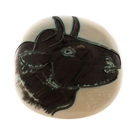 Questa ceramica raffigura un toro, uno dei temi ricorrenti nelle opere di Pablo Picasso, spesso associato alla cultura spagnola e al simbolismo della forza e della tradizione. Il piatto rappresenta il caratteristico stile grafico di Picasso, con linee semplici ma potenti e un'attenzione ai dettagli essenziali. Il rilievo e l'uso di tonalità sobrie conferiscono alla ceramica un aspetto tridimensionale, trasformandola in una vera opera d'arte scultorea. L'incisione visibile e il motivo del toro richiamano l'influenza mediterranea e la passione di Picasso per la tauromachia, rendendo questo pezzo un esempio emblematico della sua produzione ceramica durante quel periodo. Le ceramiche Madoura di Pablo Picasso, rappresentano una fase unica e innovativa nella carriera del celebre artista spagnolo. Collaborando con la manifattura Madoura di Georges e Suzanne Ramié, situata a Vallauris, nel sud della Francia, Picasso esplorò le possibilità artistiche offerte dalla ceramica, un medium che gli consentiva di fondere arte e artigianato.