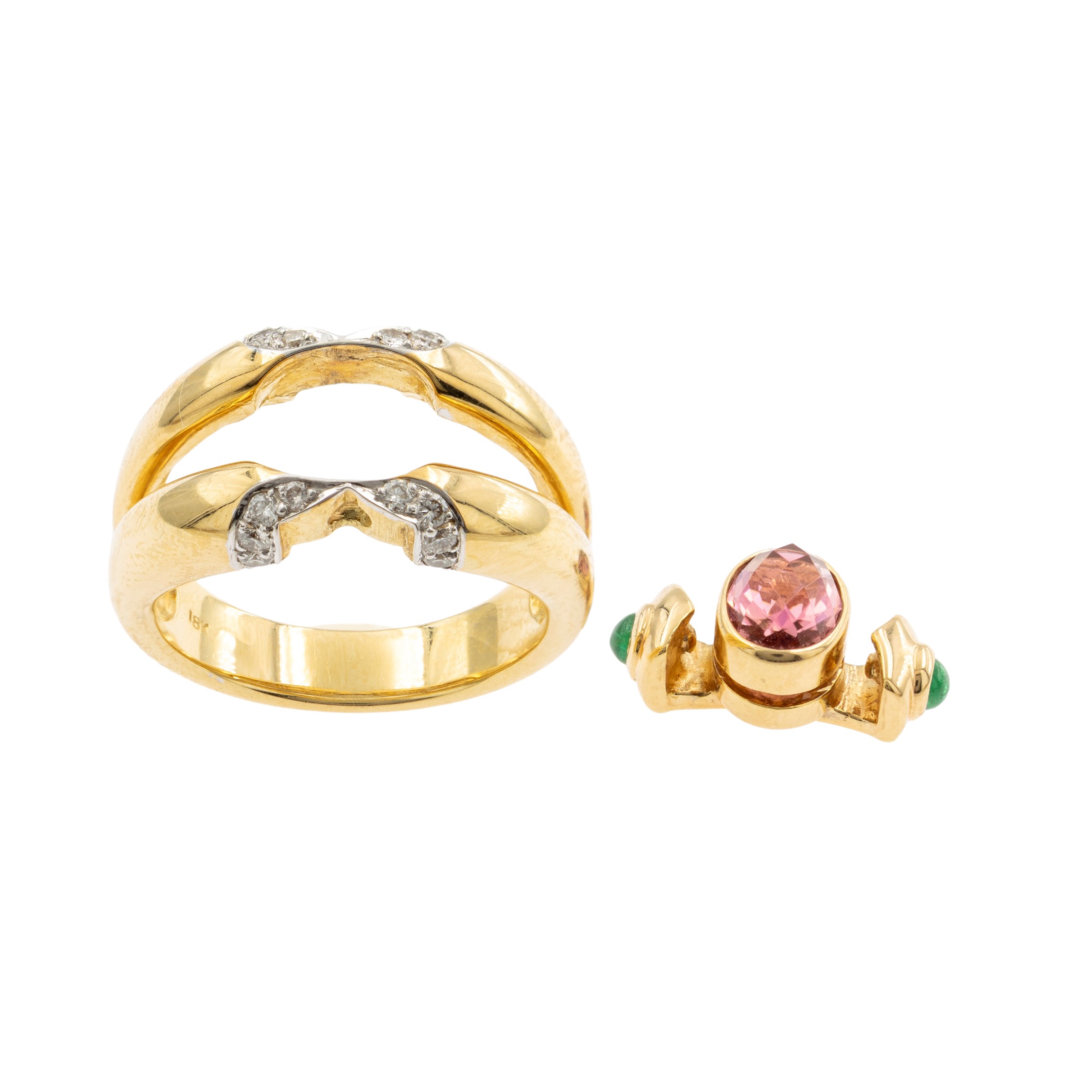 Anello a ponte in oro giallo 18kt tormalina rosa, diamanti e smeraldi