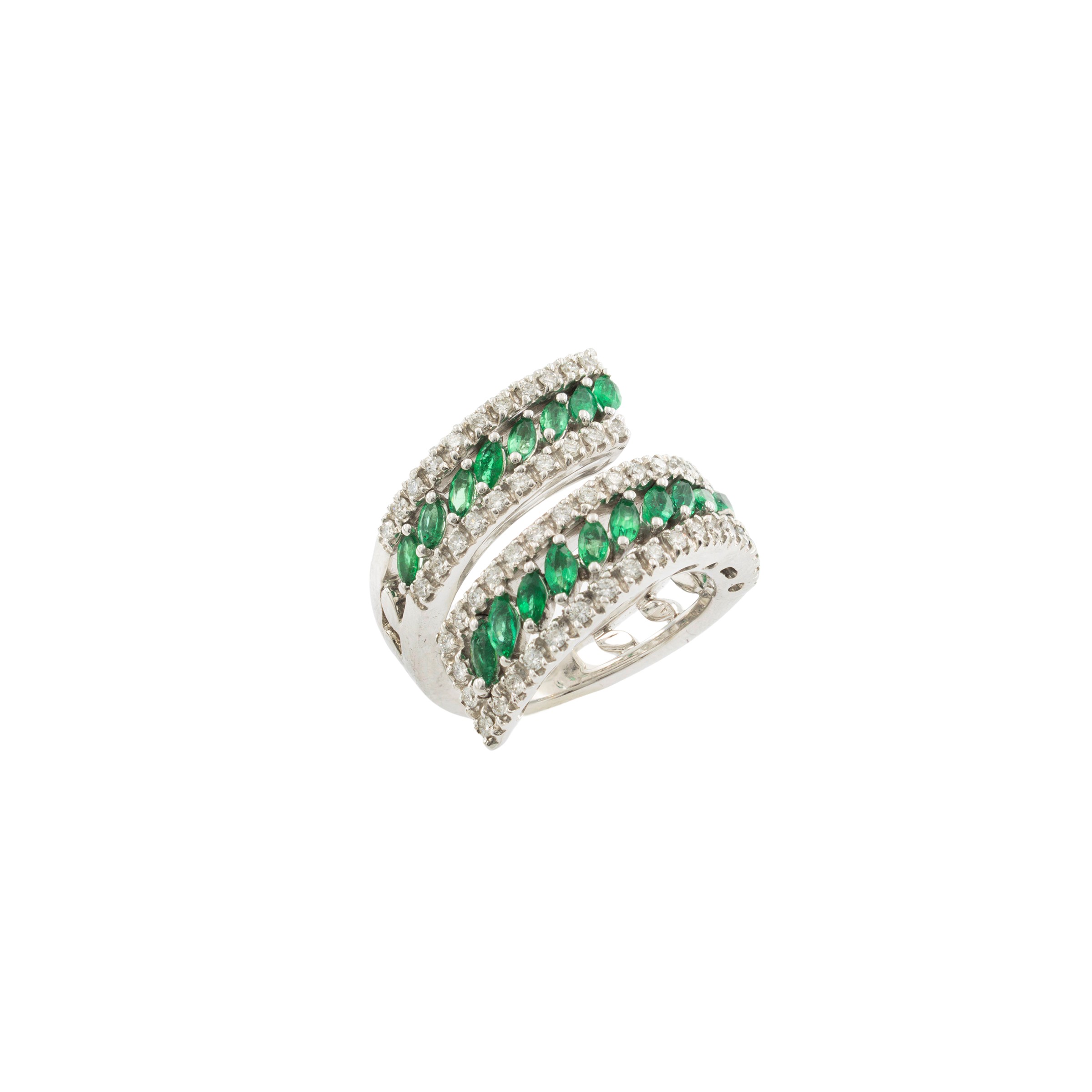 Anello contrarié in oro bianco 18kt smeraldi e diamanti
