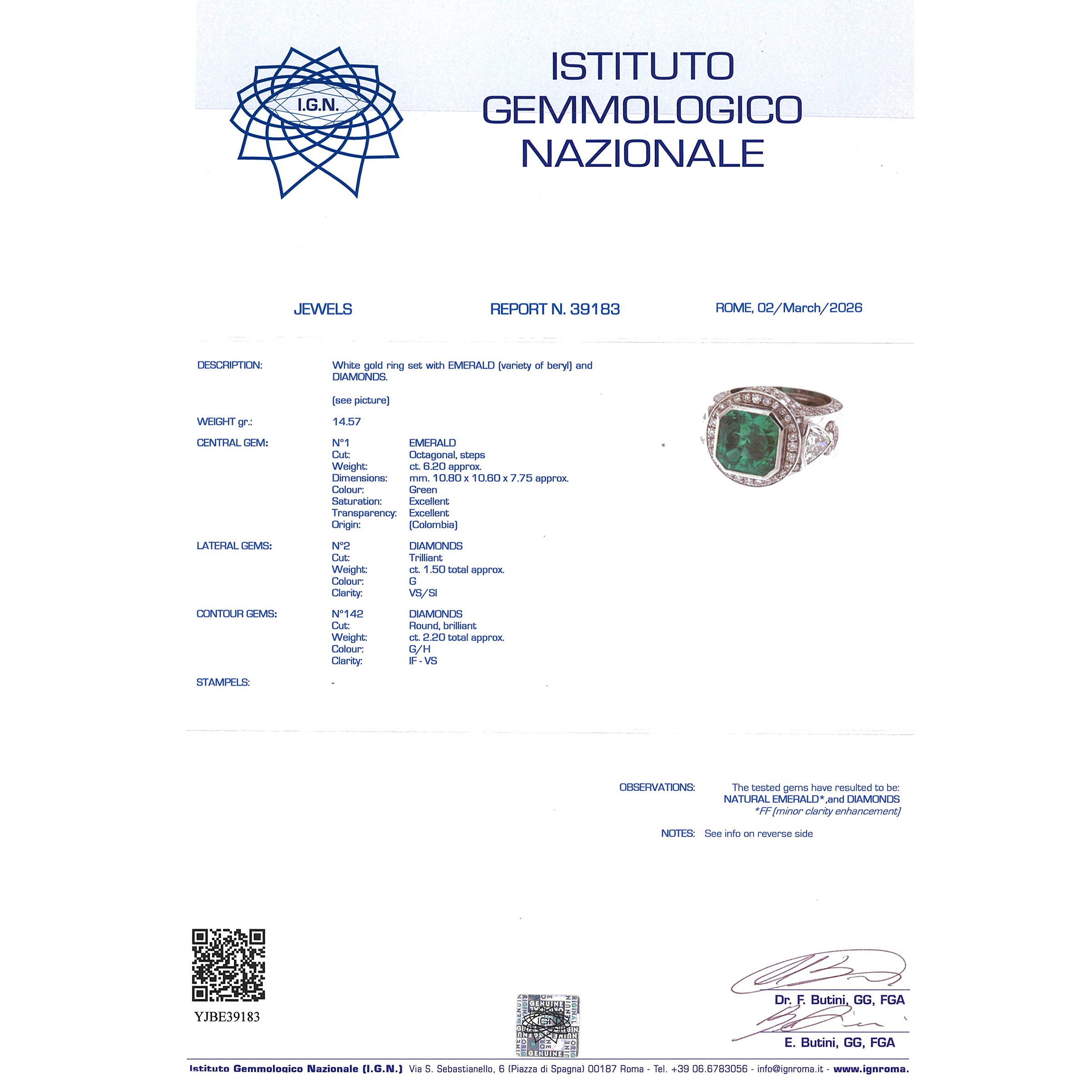 peso 14 gr.smeraldo ct 6,20 circa, due diamanti taglio trilliant ct 1,50 circa, colore G - purezza VS/SI, diamanti taglio brillante ct 2,20 circa, colore G/H - purezza IF/VS, misura 14, completo di certificato gemmologico