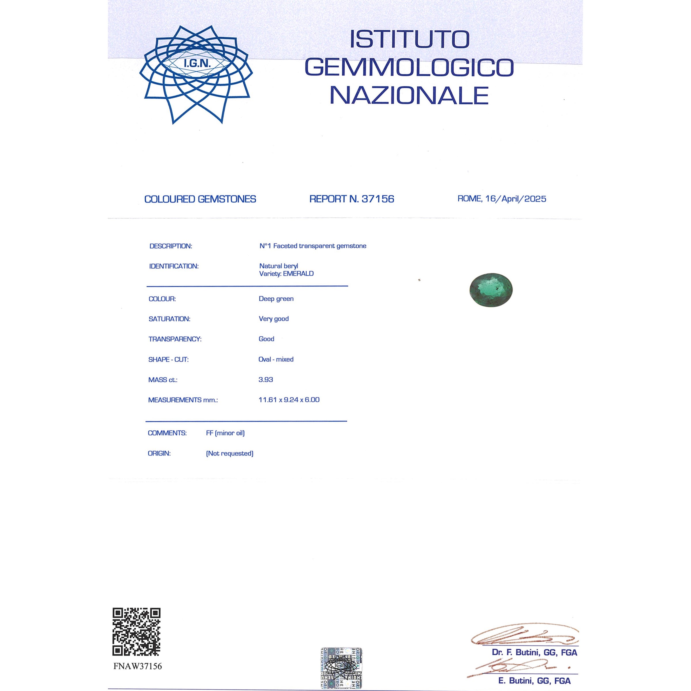 smeraldo taglio ovale misto ct 3,93 circa, ai lati due diamanti naturali taglio a triangolo ct 1,80 circa, misura 11, completo di certificato gemmologico