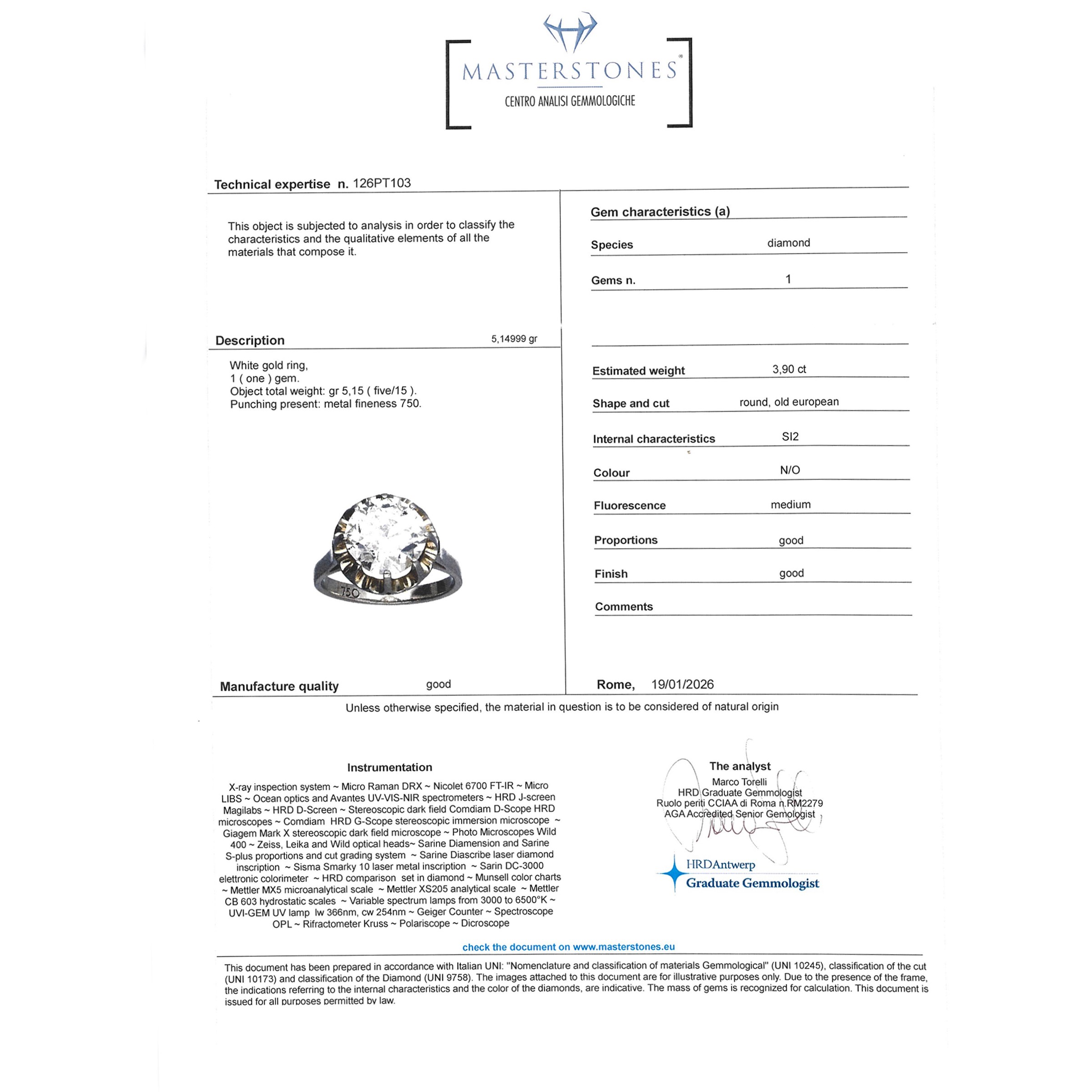 ct 3,90 circa, colore N/O - purezza SI2, completo di certificato gemmologico, misura 13