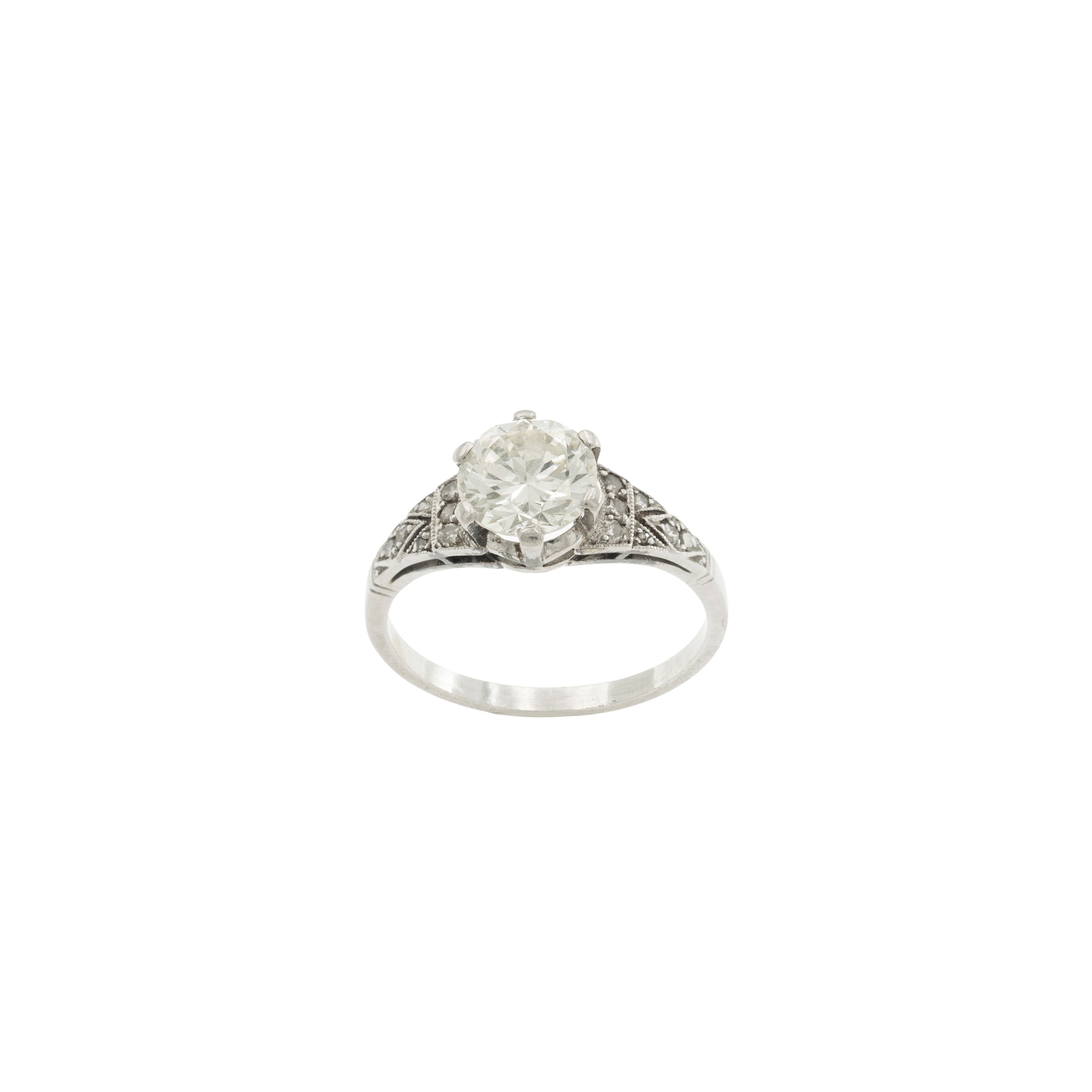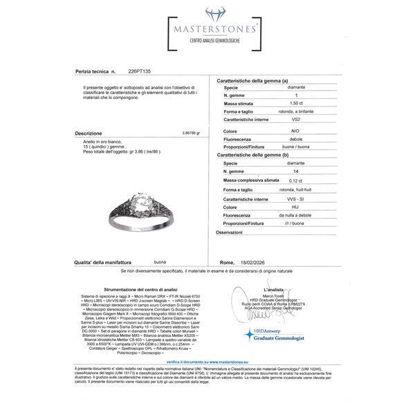 taglio brillante ct 1,50 circa, colore N/O - purezza VS2, ai lati diamanti taglio brillante ct 0,12 circa, colore H/J - purezza VVS-SI, misura 14, completo di certificato gemmologico