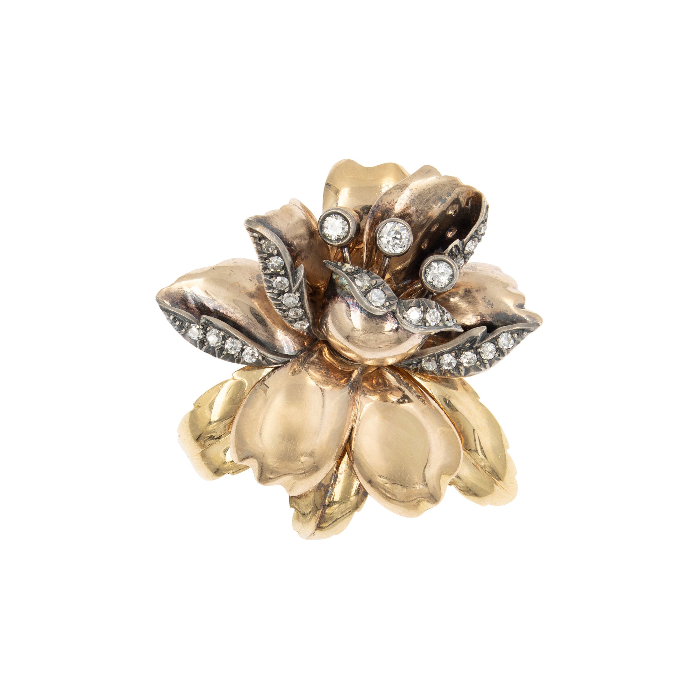 peso 18 gr.in oro a due colori 9kt argento diamanti taglio brillante antico ct 1 circa, dimensioni 4,6x4,5 cm.
