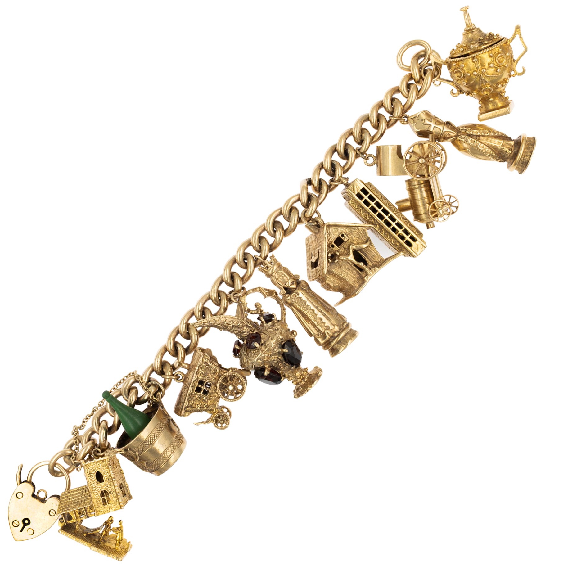 peso 142 gr.a maglia groumette con dieci pendenti, fogge e misure diverse, chiusura a lucchetto, lunghezza 18 cm.