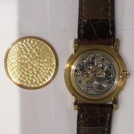 in oro giallo 18kt, cassa tonda 31 mm. ref. 58282, quadrante bianco con numeri romani, movimento meccanico a carica manuale, calibro 2003, cinturino con fibbia in metallo dorato, cassa quadrante e movimento firmati