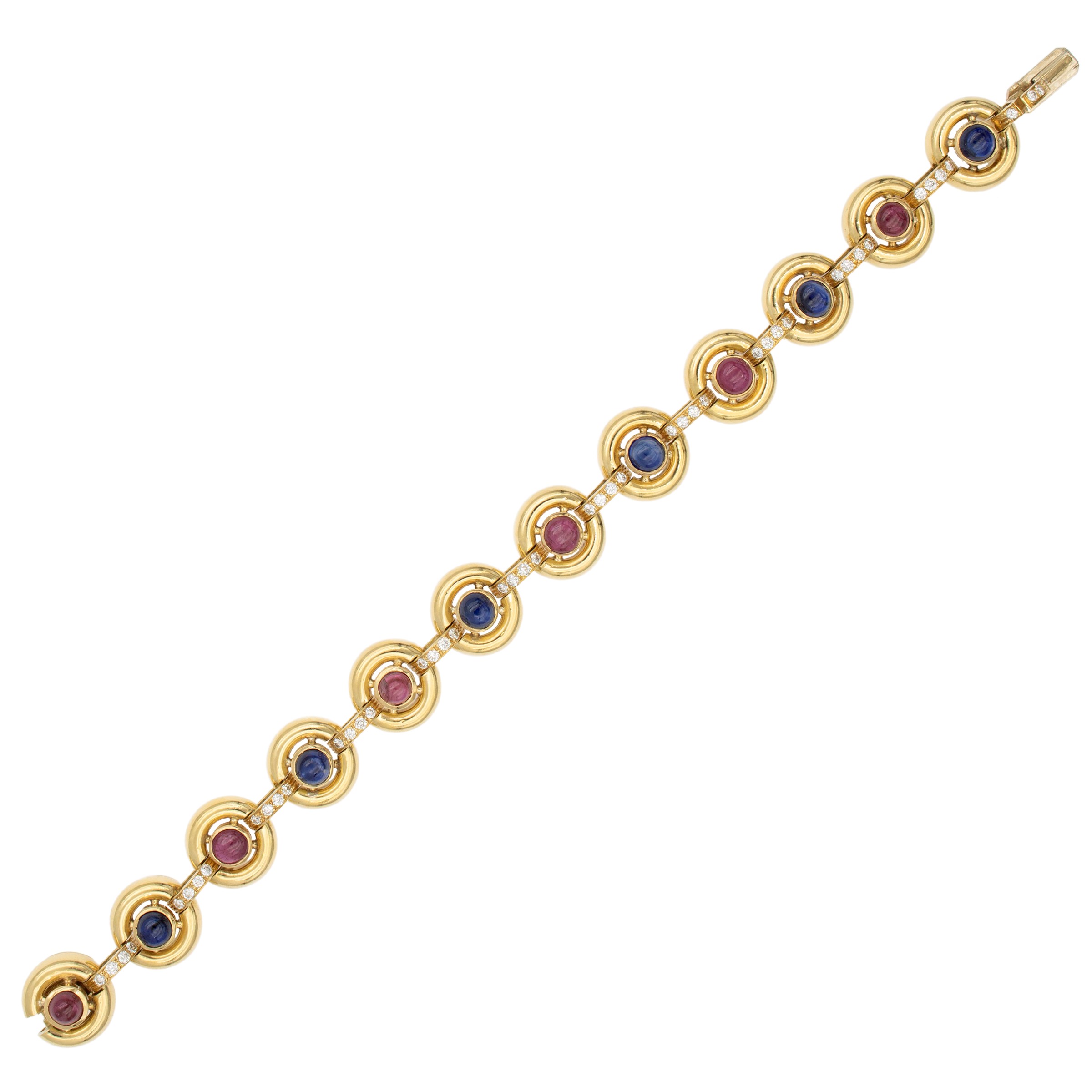 zaffiri e rubini taglio cabochon ct 2,50 ciascuno, alternati da diamanti taglio brillante ct 1 circa, chiusura a scomparsa, lunghezza 19 cm.
