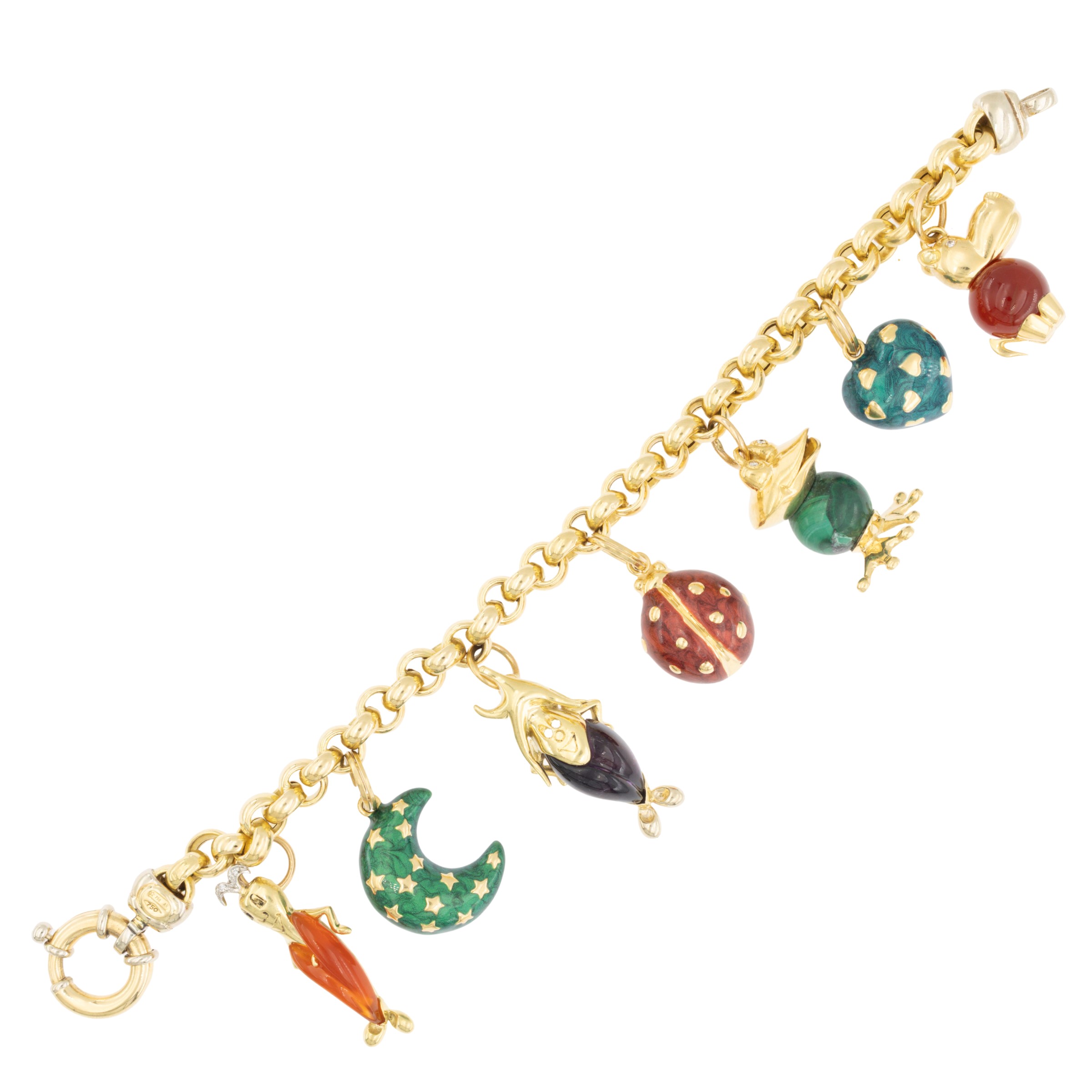peso 59 gr.fogge e misure diverse in oro giallo, smalto policromo, corniola, ametista, malachite e calcedonio, lunghezza 19 cm.