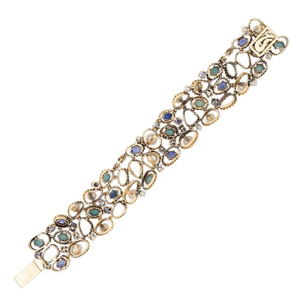 Bracciale in oro giallo 18kt, diamanti, zaffiri, turchesi e perle coltivate
