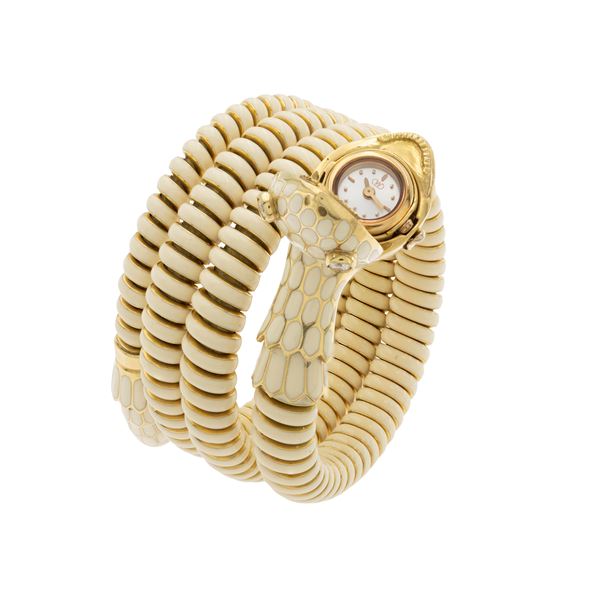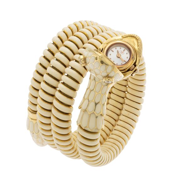 Bracciale orologio a serpente in oro giallo 18kt, smalto e diamanti