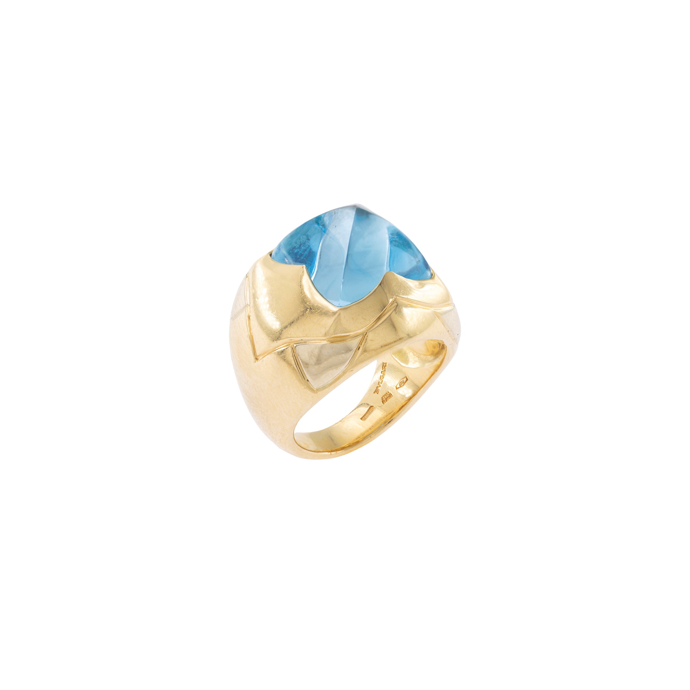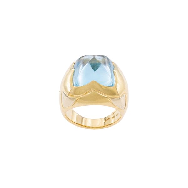 peso 18 gr.in oro a due colori 18kt con topazio azzurro taglio a piramide, misura 10