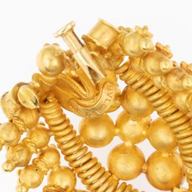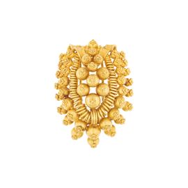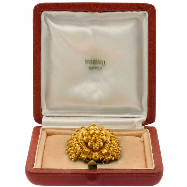 peso 38 gr.in oro giallo 22kt a forma di scudo composta da boules con applicazioni in filigrana, dimensioni 4,9x3,6 cm. completa di scatola