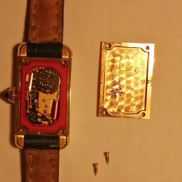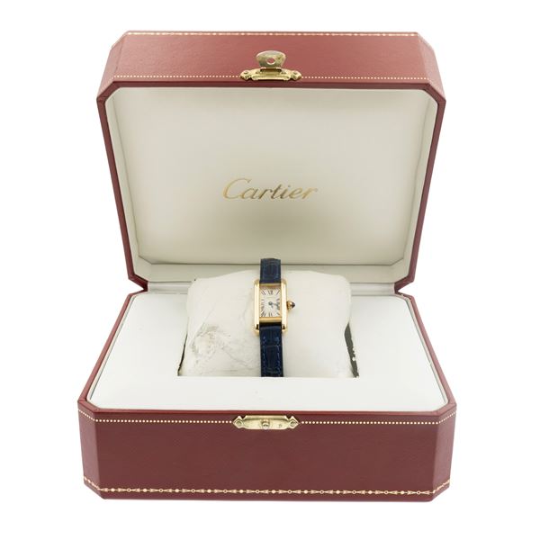 peso 17 gr.in oro giallo 18kt, ref. 828004 - 0910, cassa 28x14 mm. quadrante crema con numeri romani, vetro zaffiro, corona con zaffiro, movimento al quarzo, calibro eta 280002, cinturino con fibbia originale placcata oro, lunghezza 19 cm. completo di scatola, cassa, quadrante e movimento firmati