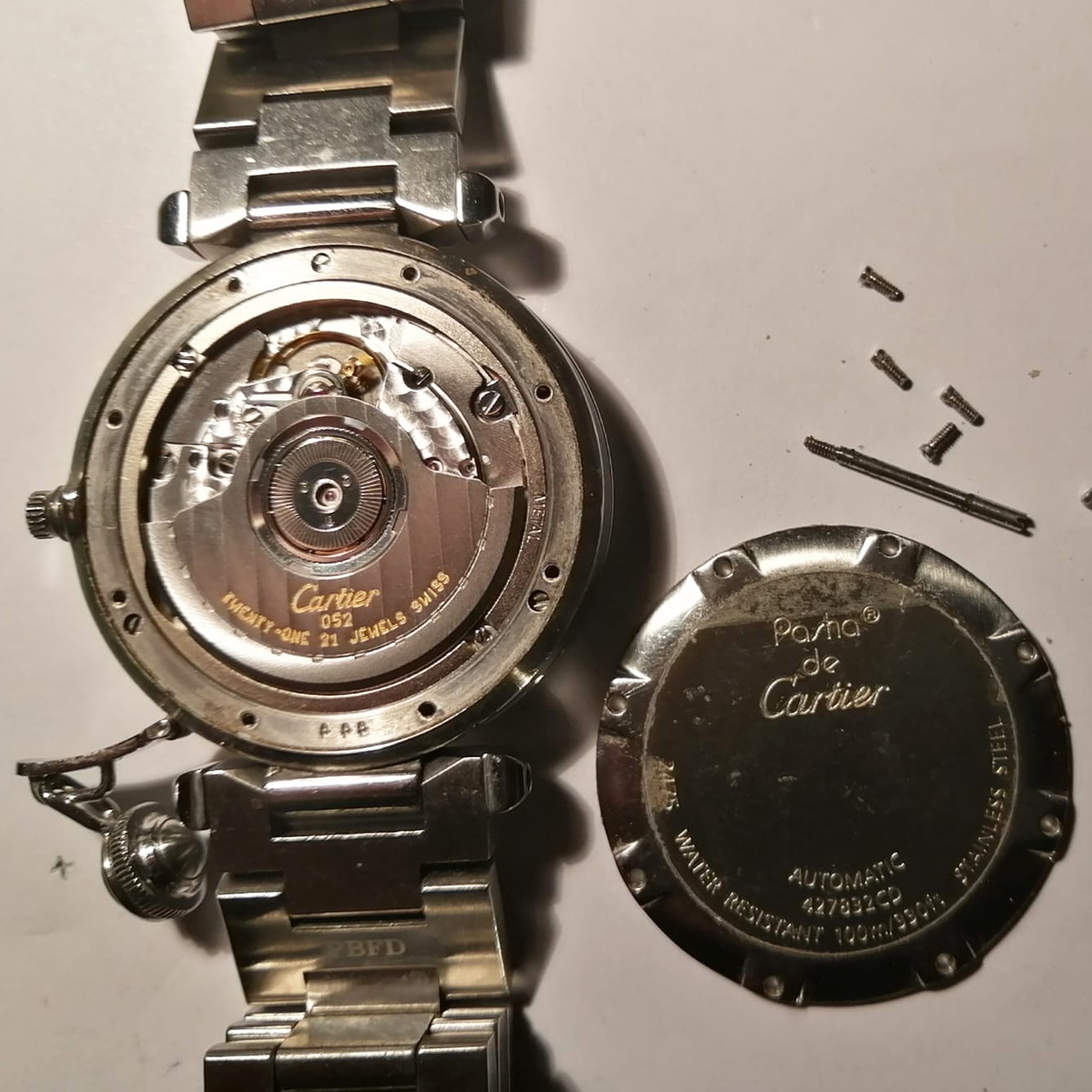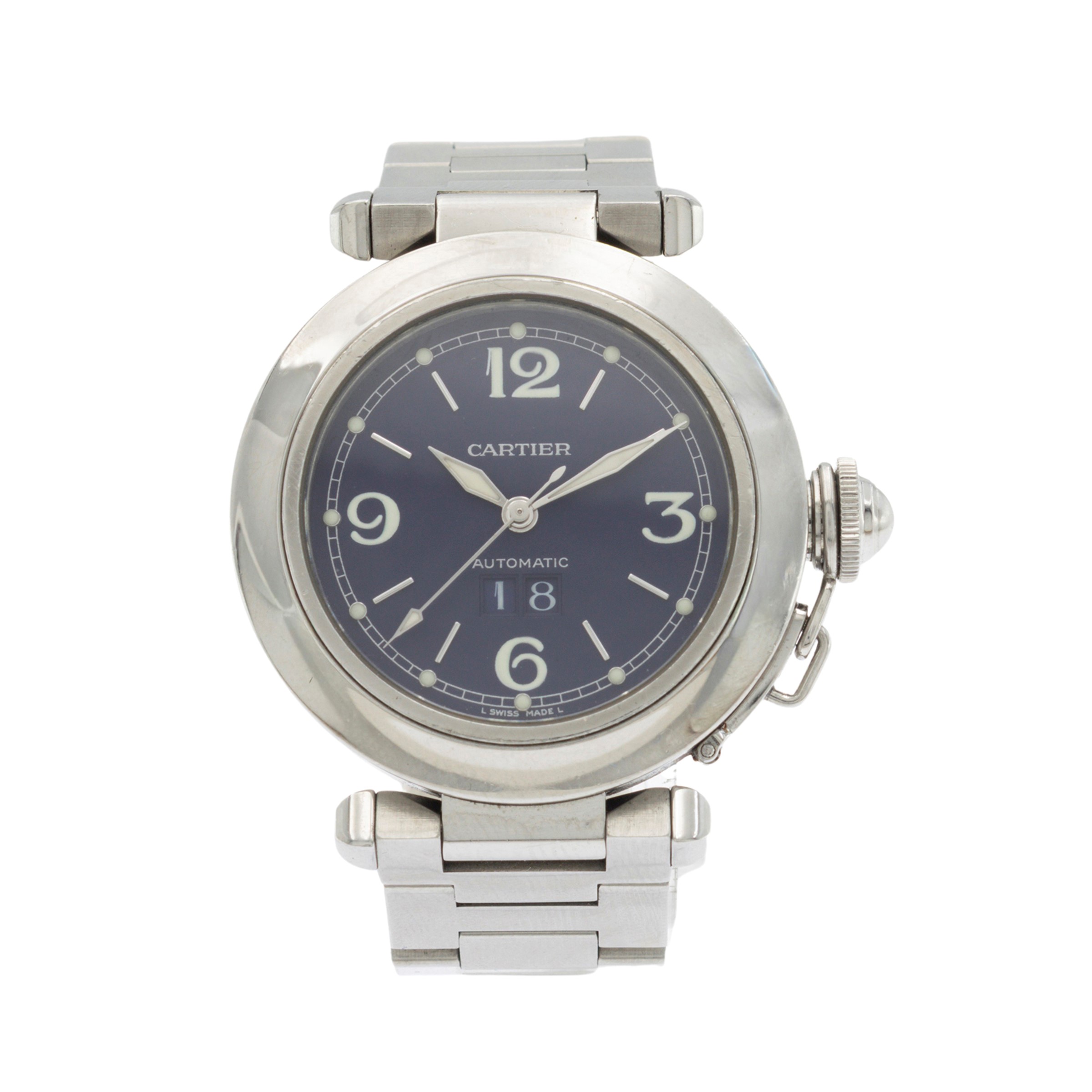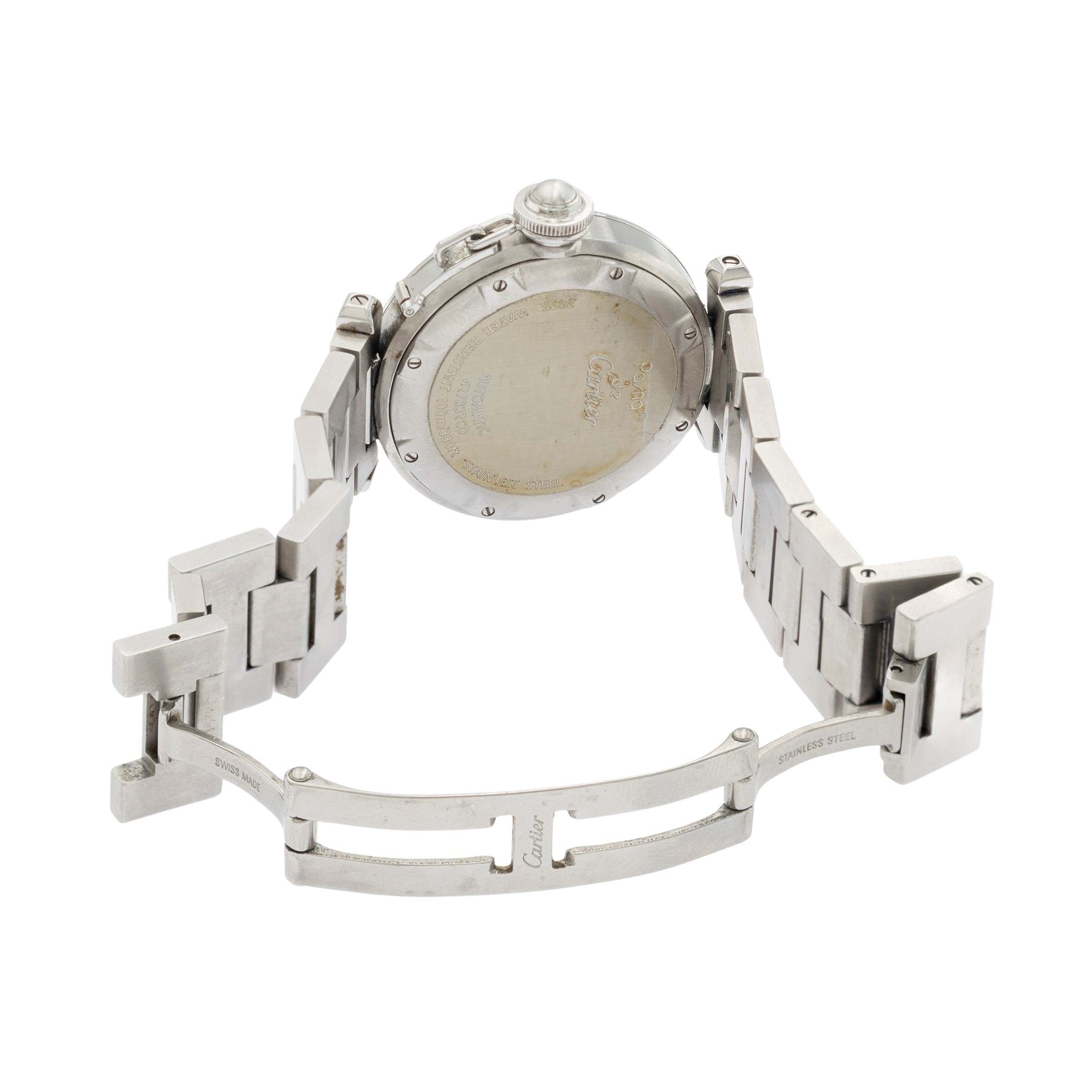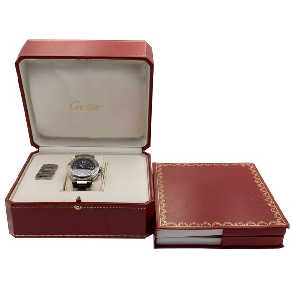lunghezza 19 cm.in acciaio, ref. 5475 - 427832CD, cassa 35 mm. quadrante blu con indici e numeri arabi, datario ore 6, movimento meccanico a carica automatica, calibro 052, bracciale originale in acciaio con chiusura deployante, completo di scatola, garanzia e tre maglie supplementari, cassa, quadrante, e movimento firmati