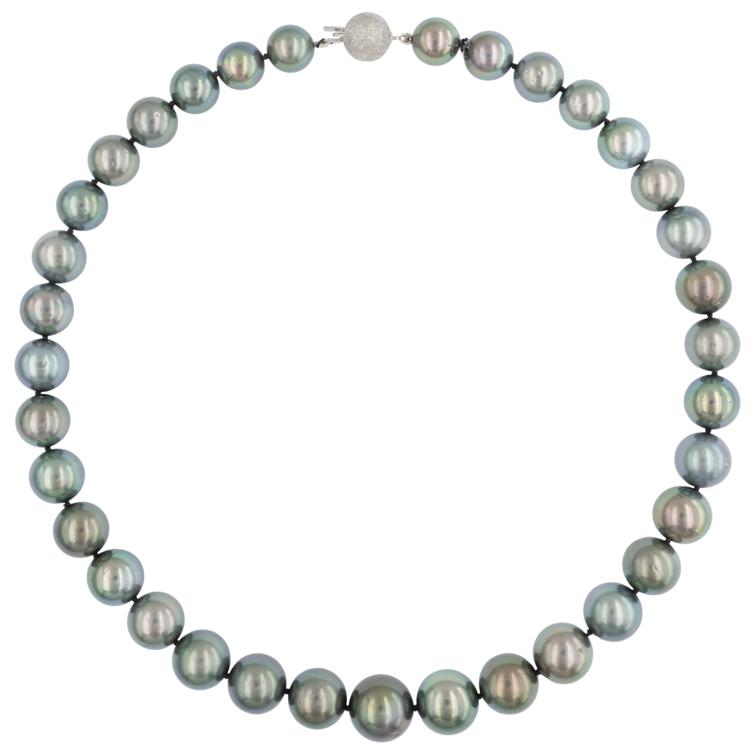 peso 76 gr.sfere da 10 a 13 mm. circa, chiusura a boule in oro bianco 18kt, lunghezza 42 cm.