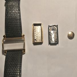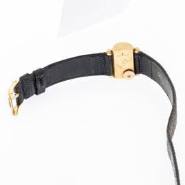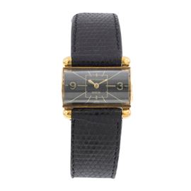 lunghezza 18 cm.in oro giallo 18kt, cassa a ponte 22x20 mm. ref. A 46197, quadrante nero con indici e numeri arabi, vetro alcuni segni di usura, movimento meccanico a carica manuale, cinturino con fibbia Omega placcata oro, cassa, quadrante e movimento firmati