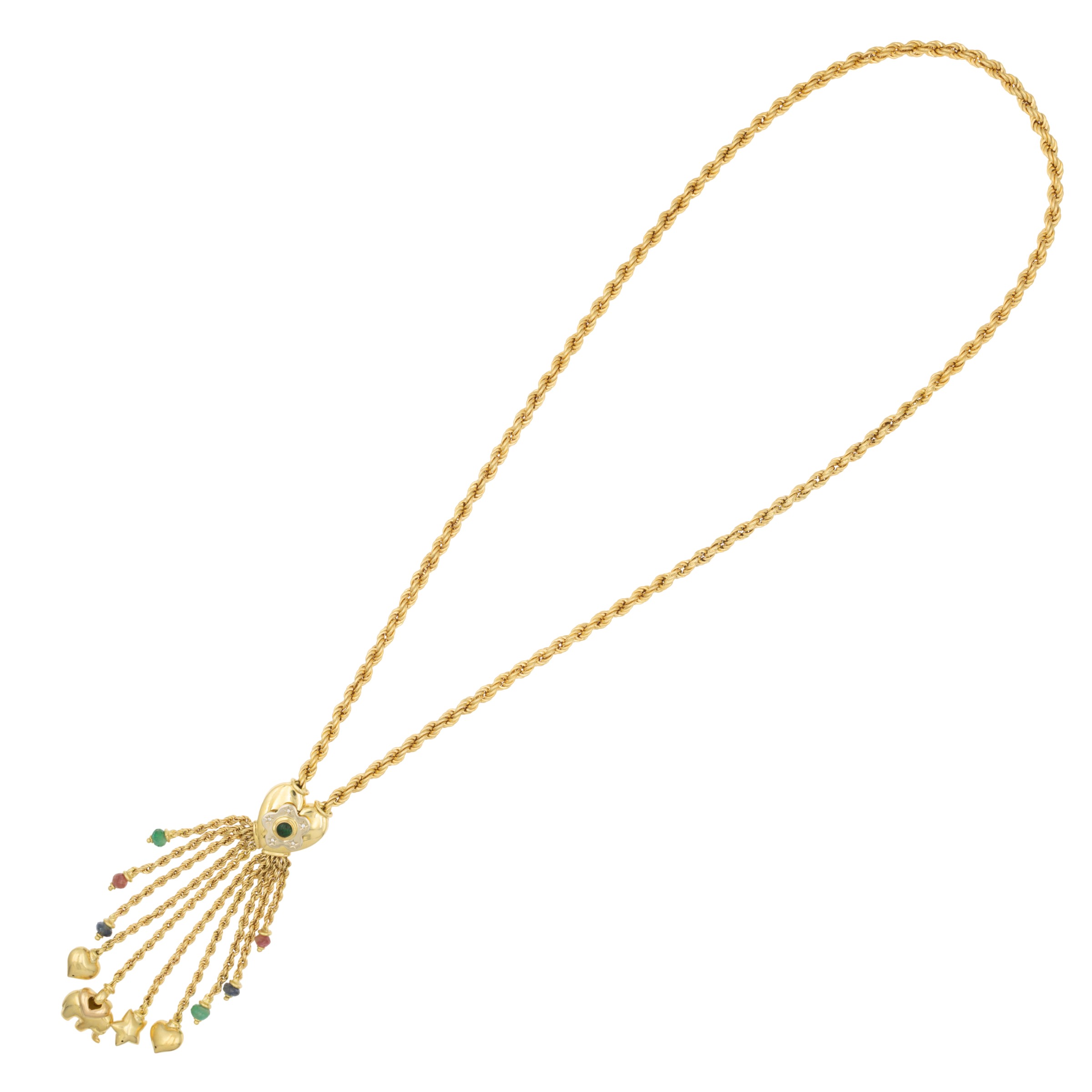 peso 56 gr.centrale a cuore con pendenti, fogge e misure diverse in oro giallo con smeraldi, rubini e zaffiri, lunghezza 72 cm.