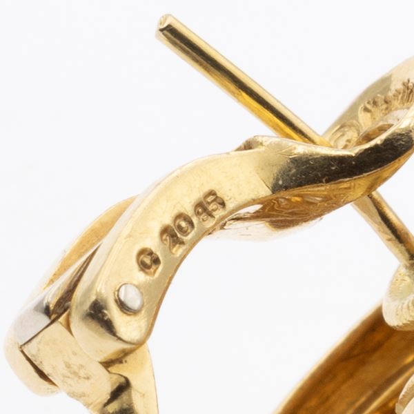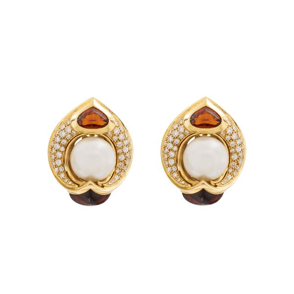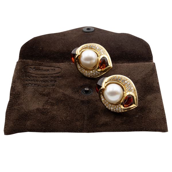 peso 31 gr.in oro giallo 18kt perle 12 mm. circa, diamanti taglio brillante ct 1 circa e quarzi citrini, dimensioni 3x2,4 cm. completi di custodia in tessuto