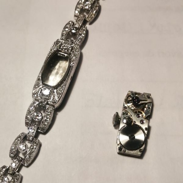peso 31 gr.in oro bianco 18kt, ref. 11382647, cassa 15 mm. con diamanti taglio brillante, quadrante argentato con indici, movimento meccanico a carica manuale, calibro 440, corona di carica sotto la cassa, bracciale in oro bianco 18kt e diamanti taglio brillante ct 2 circa, lunghezza 16 cm.
