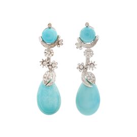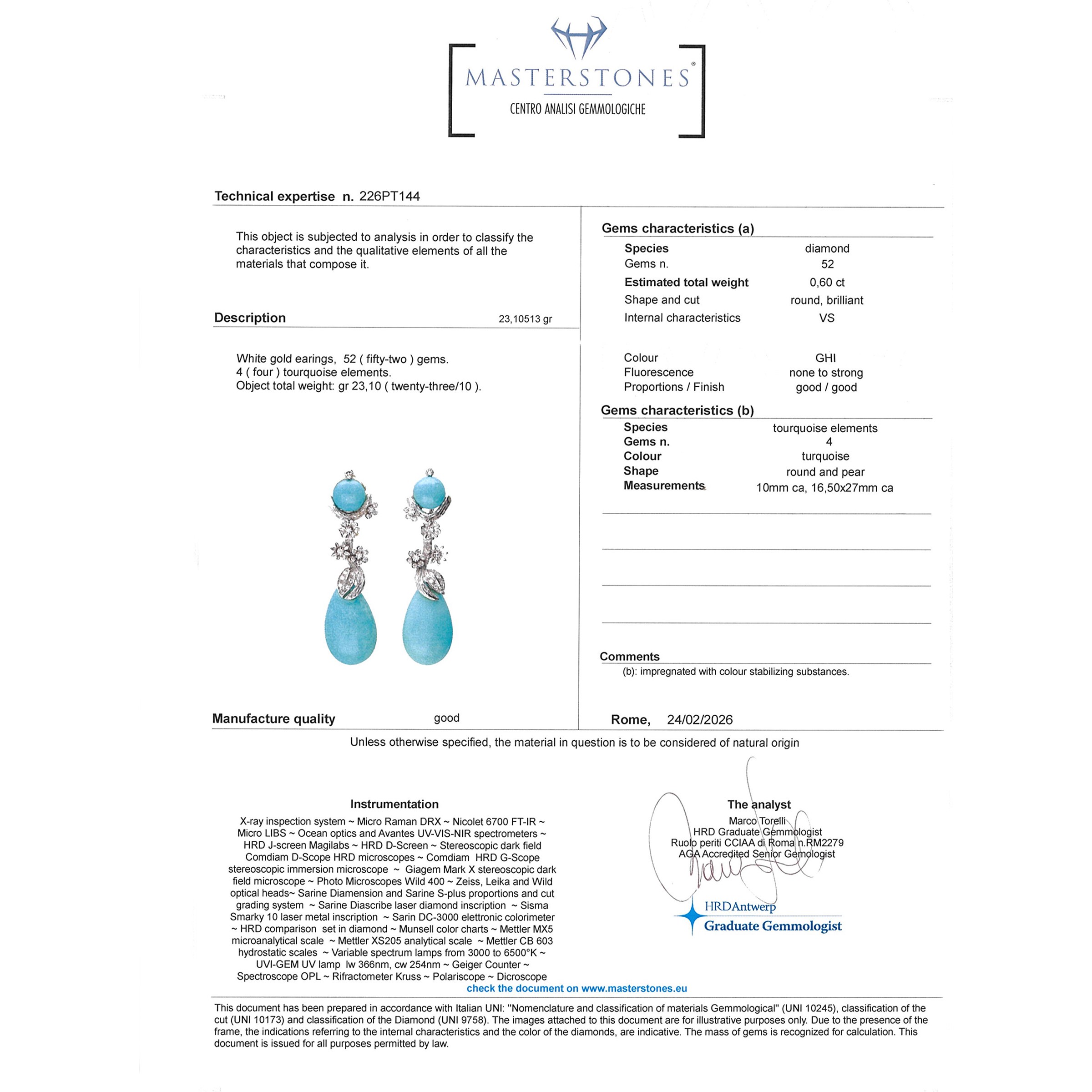 peso 12 gr.turchesi 10x16,50x27 mm. diamanti taglio brillante ct 0,60 circa, colore G/H/I - purezza VS, lunghezza 6 cm. completo di certificato gemmologico