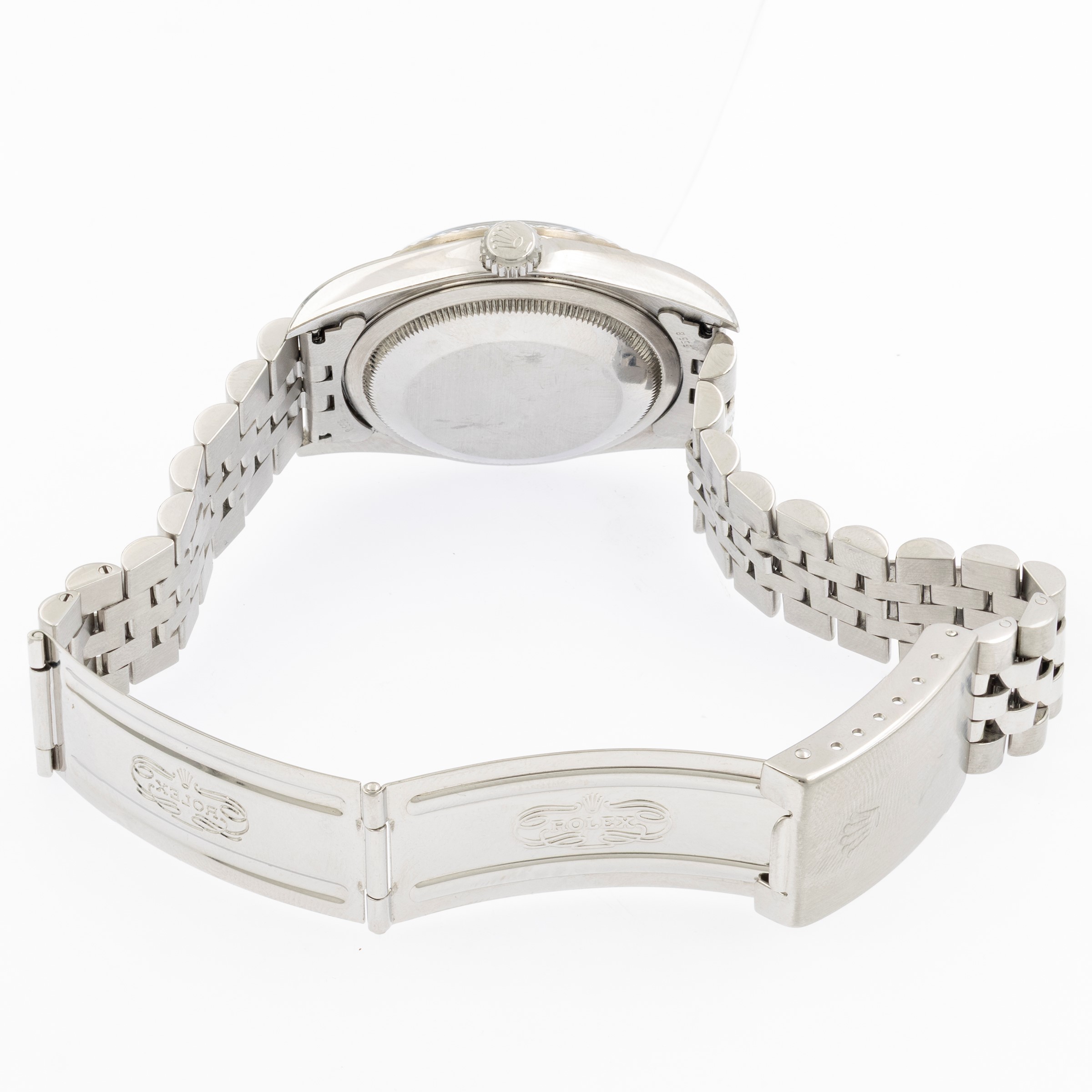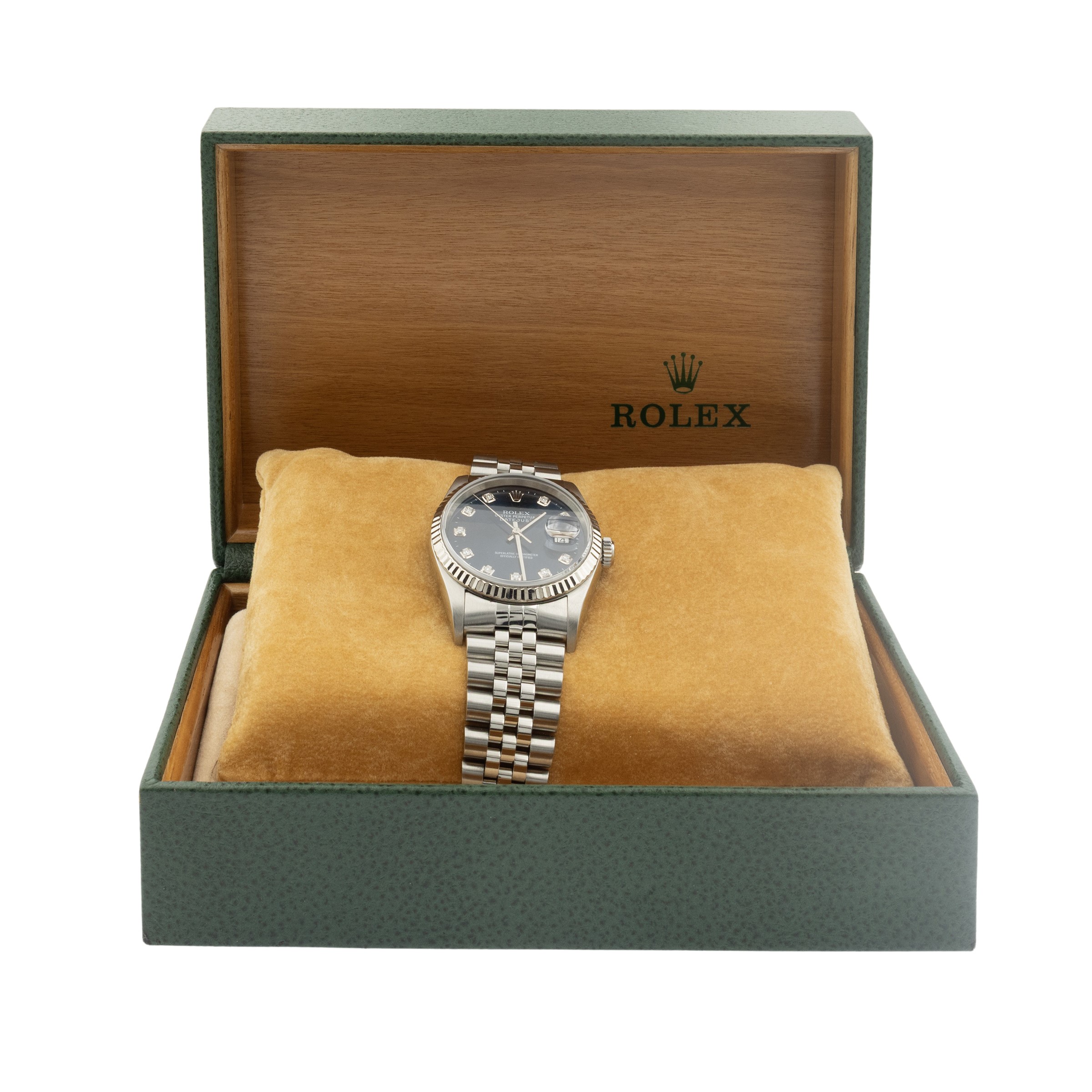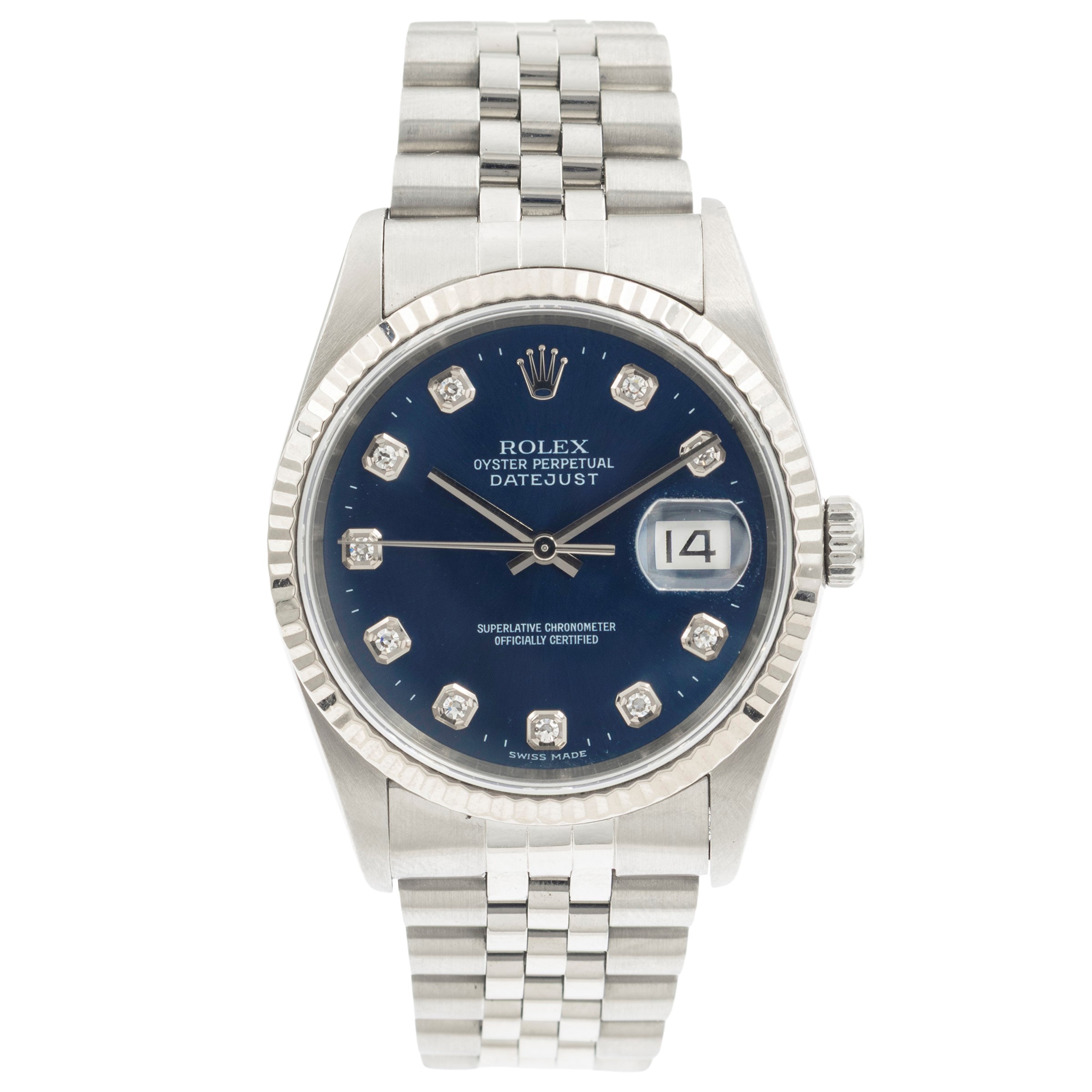 in acciaio, ref. 16234 - 961139, cassa 36 mm. ghiera in oro bianco 18kt, quadrante blu indici con diamanti taglio brillante, datario ore 3, vetro zaffiro, movimento meccanico a carica automatica, calibro 3135, bracciale jubileé in acciaio con chiusura deployante, completo di scatola, cassa, quadrante e movimento firmati